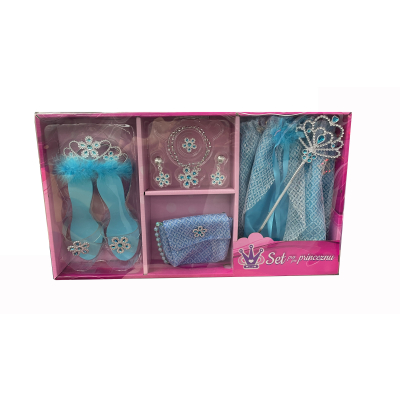 Každá holčička by chtěla být princeznou. Bav se s tímto princeznovským setem a ukaž jaká jsi princezna. Sada obsahuje sukýnku, pantoflíčky, korunku, kabelku, hůlku a šperky v modré barvě.