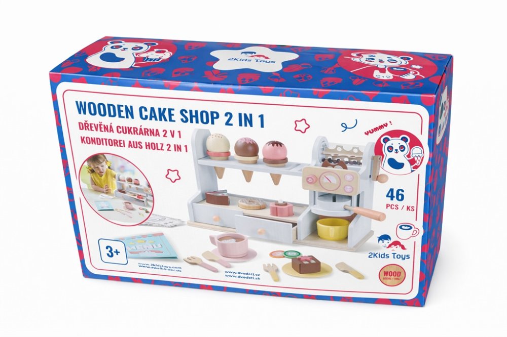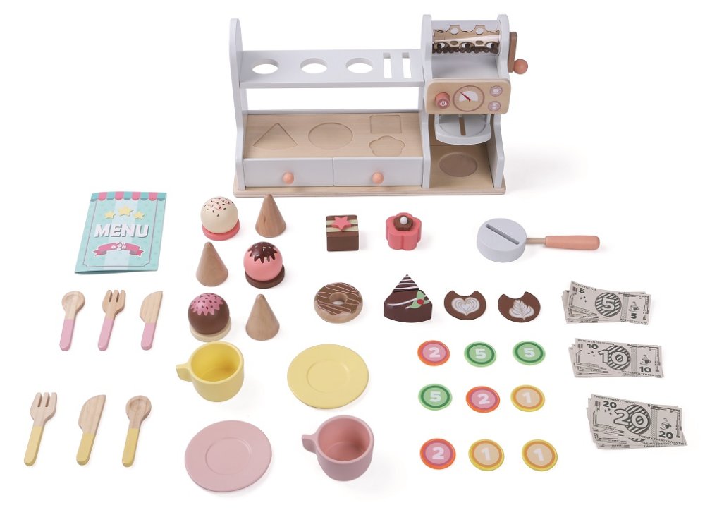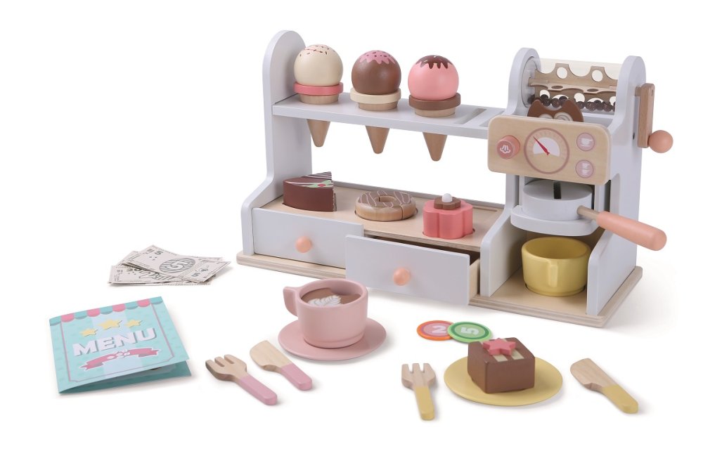 Staň se opravdovým baristou či obchodníkem! Je libo zmrzlinu, dortík nebo jen lahodnou kávu? S touto 46dílnou sadou si užijete hodiny zábavy. Sada nabízí šálky s podšálky, příbory a lžíce, pultík s kávovarem, vitrínou s dortíky a poličkou s díry na zmrzliny. Nechybí ani zásuvky s úložným prostorem pro peníze, které jsou také součástí této sady. Hračky na hraní rolí popouštějí v dětech fantazii a inspirují ke kreativní hře, což má příznivý dopad i na jejich slovní zásobu a rozvoj jazyka. Hlavní vlastnosti: obsahuje 46 dílůpodporuje rozvoj jazyka a slovní zásoby