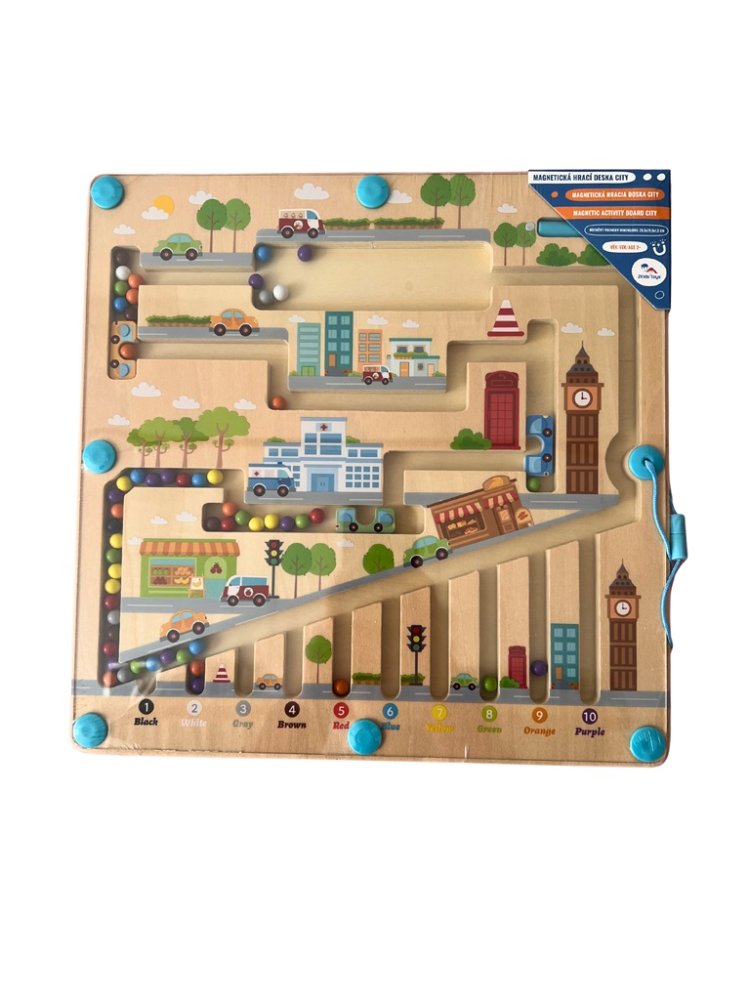 Vydejte se na cestu městem s barevnými kuličkami. Provedete úspěšně různobarevné kuličky všemi zákoutími? K převozu Vám pomohou barevné autobusy. K vedení kuliček se při hře využívá magnetické ukazovátko, které prověří dětskou trpělivost a koordinaci rukou a zraku. Dokážete pak navrátit kuličky zpět na své místo podle barvy? Zábavná dřevěná hra, která pomáhá dětem rozvíjet jemnou motoriku, orientovat se v prostoru a rozšiřovat slovní zásobu pojmenováváním barev a předmětů ve městě. Děti se také učí základy počtů formou hry. Dřevěná základna v designu města je kryta odolnou průhlednou plastovou deskou, hračka je díky tomu bezpečná. Hlavní vlastnosti: úvod do světa počtůrozvíjí motorické dovednosti dětí zábavné i bezpečné díky magnetickému principu