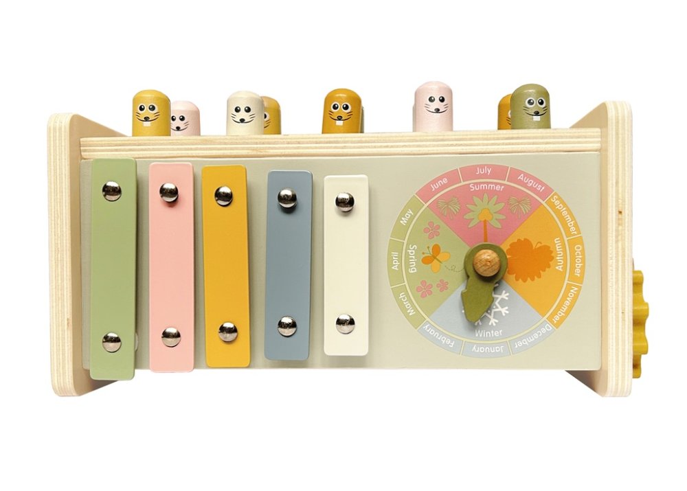Zatloukačka, lovení rybiček, otočná ozubená kolečka a vrtule, posuvný labyrint s kuřátkem, ručičkové hodiny… A to zdaleka není všechno! Tato bohatě vybavená multifunkční hračka nabízí dětem pestré možnosti, jak si hrát a zároveň rozvíjet důležité dovednosti. Součástí je veselá zatloukačka s krtky a dřevěné kladívko, se kterým si děti procvičují sílu úderu a přesnost. Magnetická udice slouží k chytání barevných rybiček, což pomáhá rozvíjet trpělivost, koordinaci a jemnou motoriku. Nechybí ani barevný xylofon s paličkou, který rozvíjí hudební sluch a smysl pro rytmus. Díky mnoha různorodým aktivitám tato dřevěná hračka zabaví děti na dlouhou dobu a podněcuje jejich zvídavost, logické myšlení i smyslové vnímání. Vše je vyrobeno z kvalitního a bezpečného dřeva v pastelových barvách s motivy zvířátek. Xylofon není hudební nástroj, jedná se pouze o hračku. Hlavní vlastnosti: 8 dílůzatloukací hra, kladívko, udice, paličkamultifunkční hračkapodněcuje vnímavost, logické myšlení a smyslové vnímánípodporuje jemnou motoriku a koordinaci ruka-okovhodné pro děti od 2 let