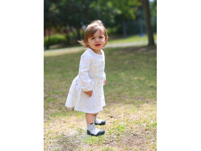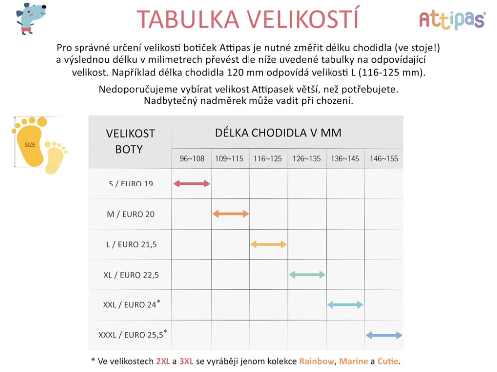 Obuv Attipas je vhodná pro děti od 6 měsíců do 3 let. Botičky jsou určeny jak pro děti, které teprve začínají chodit, tak i pro dobré chodce.Obuv Attipas je extrémně měkká, flexibilní a kopíruje tvar nohy dítěte s cílem usnadnit přirozený vývoj dětských nohou.Proč právě ATTIPAS.Vědci z celého světa prokázali, že chůze a běh naboso má kladný vliv na celý organismus. Chůze v barefoot botičkach Attipas je maximálně přiblížena k přirozené chůzi naboso, což je velice prospěšné nejen pro nožičky, ale i pro celý organismus.Attipas je chytrá obuv. Aby se noha dítěte správně vyvíjela, potřebuje mít dostatek prostoru i pro pohyb prstů. Dětské botičky ATTIPAS tento pohyb umožňují díky své rozšířené špičce.Klíčové výhody dětských botiček Attipas.- Komfort. Měkká podrážka, která neklouže.- Prodyšnost. Prodyšná podrážka, díky které dětská noha může dýchat a nezapařuje se.- Zdraví. Volná špička podporuje správný stereotyp chůze a nebrání krevnímu oběhu dětské nožky. Obuv byla vyvíjena špičkovými designéry, v úzké spolupráci s dětskými lékaři a ortopedy.- Bezpečnost. Speciálně vyvinutá technologie výroby obuvi bez použití lepidla, toxických látek a formaldehydu.- Lehkost a flexibilita. Podrážka je ze silikonu a ponožka z bavlny. Tento jednoduchý materiál dělá obuv velice lehkou a pružnou.- Snadná údržba. Obuv je pratelná v pračce (program pro ruční praní, s použiváním síťky na praní).Kam se dají ATTIPASKY nosit.Multifunkční obuv Attipas je vhodná pro nošení doma a také pro nošení venku v teplém a suchém počasí.Botičky můžete využít jako capáčky na doma, nebo jako přezůvky do školek, dětských koutků, kroužků atd. Attipasky náležitě oceníte, když půjdete na návštěvu nebo do nákupního centra: botičky jsou lehké a zabírají málo místa v kabelce.V teplém a suchém počasí jsou Attipasky výborné na venkovní nošení. Jsou perfektní na hraní na venkovních hřištích, pískovištích, na chození po trávě, kamenech a při jiných outdoorových aktivitách.Attipasky se dají nosit i u bazénů, jsou skvělé na písečné nebo oblázkové pláže. Při výrobě Attipasek se nepoužívá lepidlo, proto se Attipasky nebojí vody: nerozlepí se Vám a nerozpadnou.Botičky Attipas jsou velmi lehké, flexibilní, ohybné a prodyšné – naprosto perfektní jak pro indoor, tak i pro outdoor aktivity!- Než si vyberete velikost, doporučujeme se pozorně podívat na podrobný návod měření a tabulku velikostí.- Pokud se obáváte nadměrného pocení nohou v Attipaskách nebo naopak potřebujete dodatečnou zahřívací vrstvu při chůzi po studené podlaze v zimě, doporučujeme k botkám dokoupit speciální vložky proti pocení.Materialové složení: svrchní materiál 80% bavlna 17% spandex 2% pryžová vlákna 1% polyuretánová vlákna, podrážka 100% TPR silikon (bez použití jakýchkoli toxických látek).Zacházejte opatrně- Praní Lze prát v pračce (doporučujeme ruční praní_- Nepoužívejte drsné biologické prací prostředky- Nebělit- Možnost sušení v odstředivé sušičce (doporučuje se sušení na vzduchu)Adresa dodavatele: ags 92, s.r.o., Drahobejlova 2515/18, 190 00 Praha, Česká republika ,https://ags92.com/sk/
