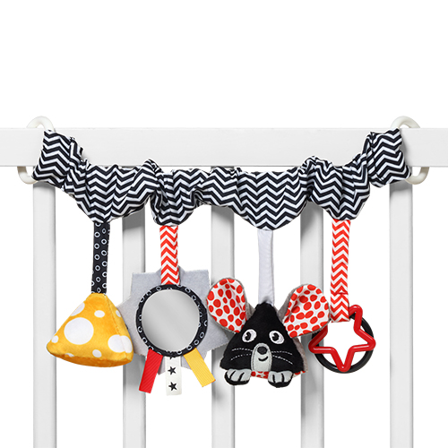 Kontrastní edukační senzorická hračka pomáhá stimulovat hmat a zrak, stejně jako rozvoj motoriky děťátka. Upevněte hračku na kočárek, postýlku nebo autosedačku, aby se děťátko zabavilo při procházce nebo cestování. Na části potažené jemnou látkou jsou…