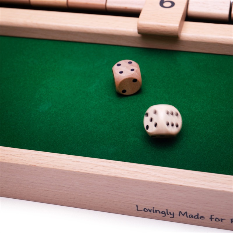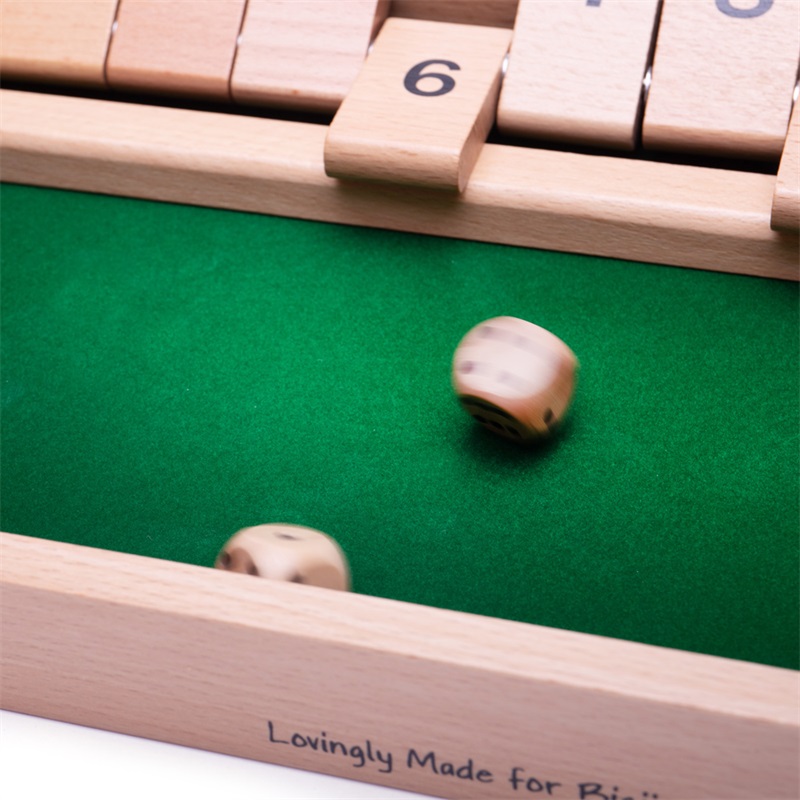 Zábavná hra, která dětem zlepší jejich numerické dovednosti. Hoďte dvojicí kostek a zavřete destičky, (maximálně dvě) které se rovnají celkovému počtu hodů kostkou. Pokračujte ve hře dokud nebude možné zavřít žádné další destičky. Zbylý součet neotočených destiček si zapište. Hraje se do určeného počtu trestných bodů, zpravidla do 200, vyhrává pak hráč s nejmenším počtem trestných bodů. Vzdělávací a zábavná hra, může ji hrát jeden nebo více hráčů. Tato dřevěná verze hry v tradičně vyrobeném dřevěném rámu s plstěnou hrací deskou. Vyrobeno z vysoce kvalitních, zodpovědně získaných materiálů. Splňuje aktuální evropské bezpečnostní normy. Skládá se ze 3 hracích prvků. Hlavní vlastnosti: hra pro jednoho nebo více hráčůobsahuje 2 kostky a hrací deskupodporuje matematické dovednosti
