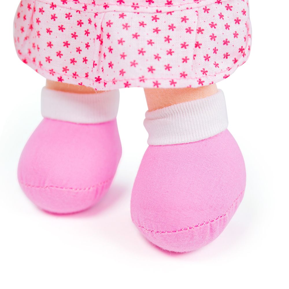 Seznamte se se Sophií – veselou, barevnou, látkovou panenkou, s níž si Vaše dítě bude určitě rádo hrát. Panenka je oblečena do kvalitního oblečení v hezkém, růžovém provedení s jemným vzorem. Měkké látkové panenky jsou skvělým způsobem, jak podpořit kreativní hraní. Hlavní vlastnosti: vyhovuje současným evropským bezpečnostním normámvhodné od narození – malá velikost