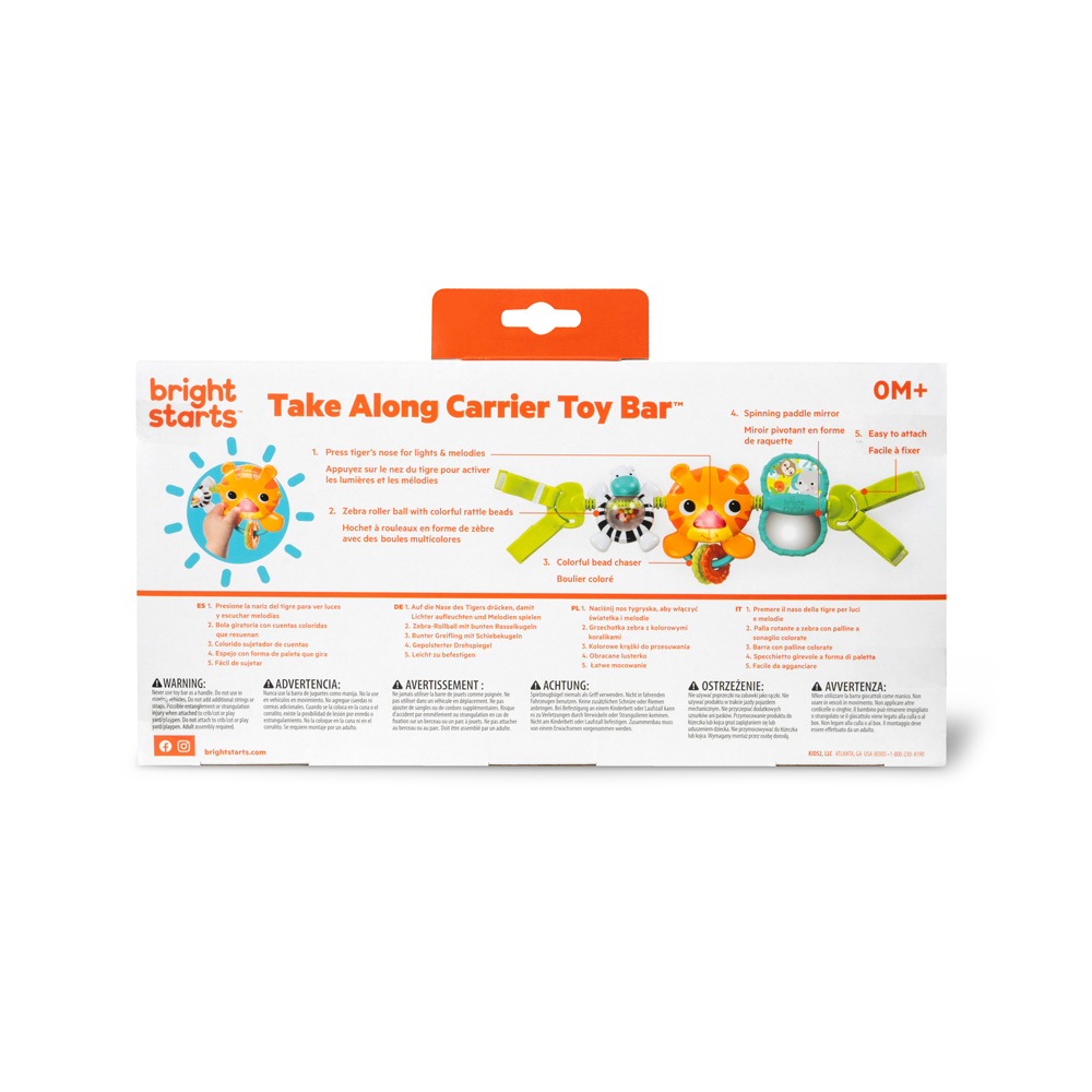 „Hračka do kočárku Tiger Bar, 0m+ „Hračka do kočárku je vhodná pro děti od narození. Nos tygra se rozsvítí a zahraje 4 melodie, když ho dítě stlačí, zebra se otáčí kolem dokola a uvnitř ní chrastí barevné korálky a v otočném zrcátku se může dítě samo vidět.Hračku lze snadno uchytit na většinu kočárků nebo autosedaček.“Vlastnosti výrobku:“- obsahuje: 3 AG-13 baterie- rozměry výrobku: 32 x 5 x 10 cm- rozměry balení: 33 x 7 x 17,5 cmDalší zajímavé akce a produkty značek bright starts, oball, ingenuity, baby einstein a Disney babyVAROVÁNÍ: Tato hračka vytváří záblesky, které mohou u citlivých jedinců vyvolat epilepsii.Adresa dodavatele: KIDS2 EUROPE BV 5 Keizersgracht 287, 1016 ED Amsterdam, Netherlands; +31 20 241 0934