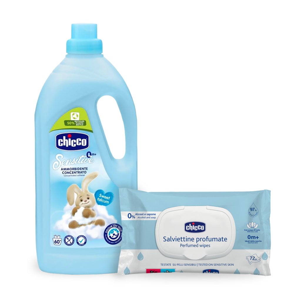 CHICCO Aviváž koncentrovaná Baby Sensitive Sladký pudr 1,5 l, 60 praní + vlhčené ubrousky 72 ks zdar