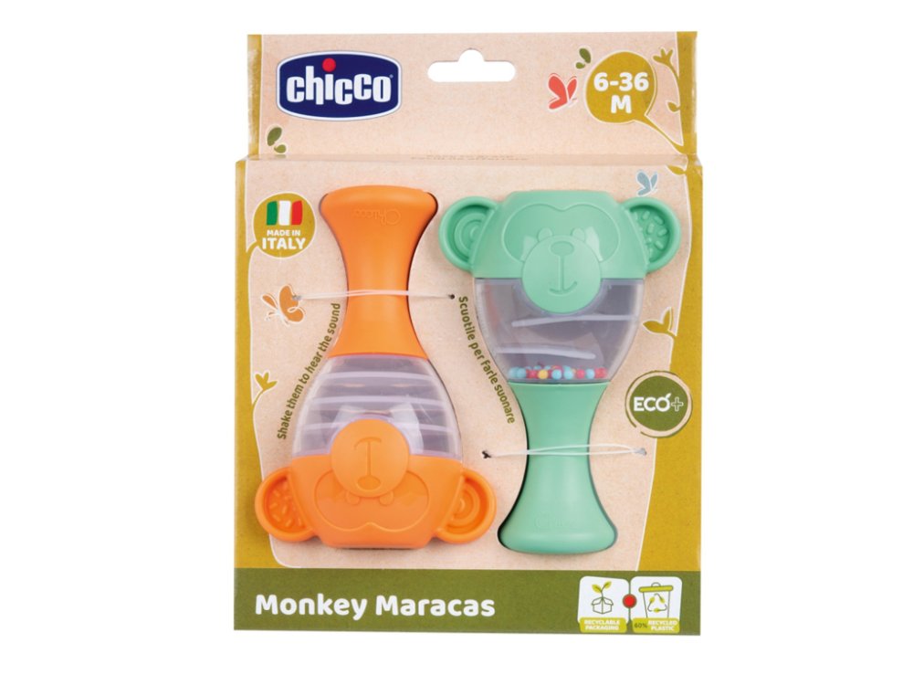 Dvě maracas ve tvaru zábavných opiček, snadno se dají uchopit a zatřást, abyste slyšeli chrastící zvuky. Vyrobeno z recyklovaného plastu.- Zatřeste jimi a otočte je vzhůru nohama, abyste viděli různé cesty, kterými se kuličky uvnitř ubírají- Pomáhají rozvíjet manuální koordinaci a sluch dětí- Snadno uchopitelné a lehké, ideální pro malé rukojeti- Vyrobeno ze 60 % recyklovaného plastu z průmyslových zbytků- Krabice je recyklovatelná a vyrobena z papíru s certifikátem FSC®, podporuje tak ochranu lesů a biodiverzitu- Vyrobeno v ItáliiRozměry: 9,5 x 15 x 7 cmPOZOR! Komponenty, které nejsou součástí hračky musí být před použitím odstraněny a uchovávejte mimo dosah dětí. Nebezpečí udušení. Pravidelně kontrolujte, zda výrobek nevykazuje známky opotřebování a poškození. Pokud výrobek je poškozen nepoužívejte jej a uchovávejte mimo dosah dětí. Používejte hračku pod neustálým dohledem dospělého. Nepřidávejte šňůrky ani popruhy. Nebezpečí uškrcení.Kontakt dodavatele: ARTSANA SPAVia S. Catelli 1 – 22070, Grandate (CO), Italy, www.chicco.com, +39 800 188 1259