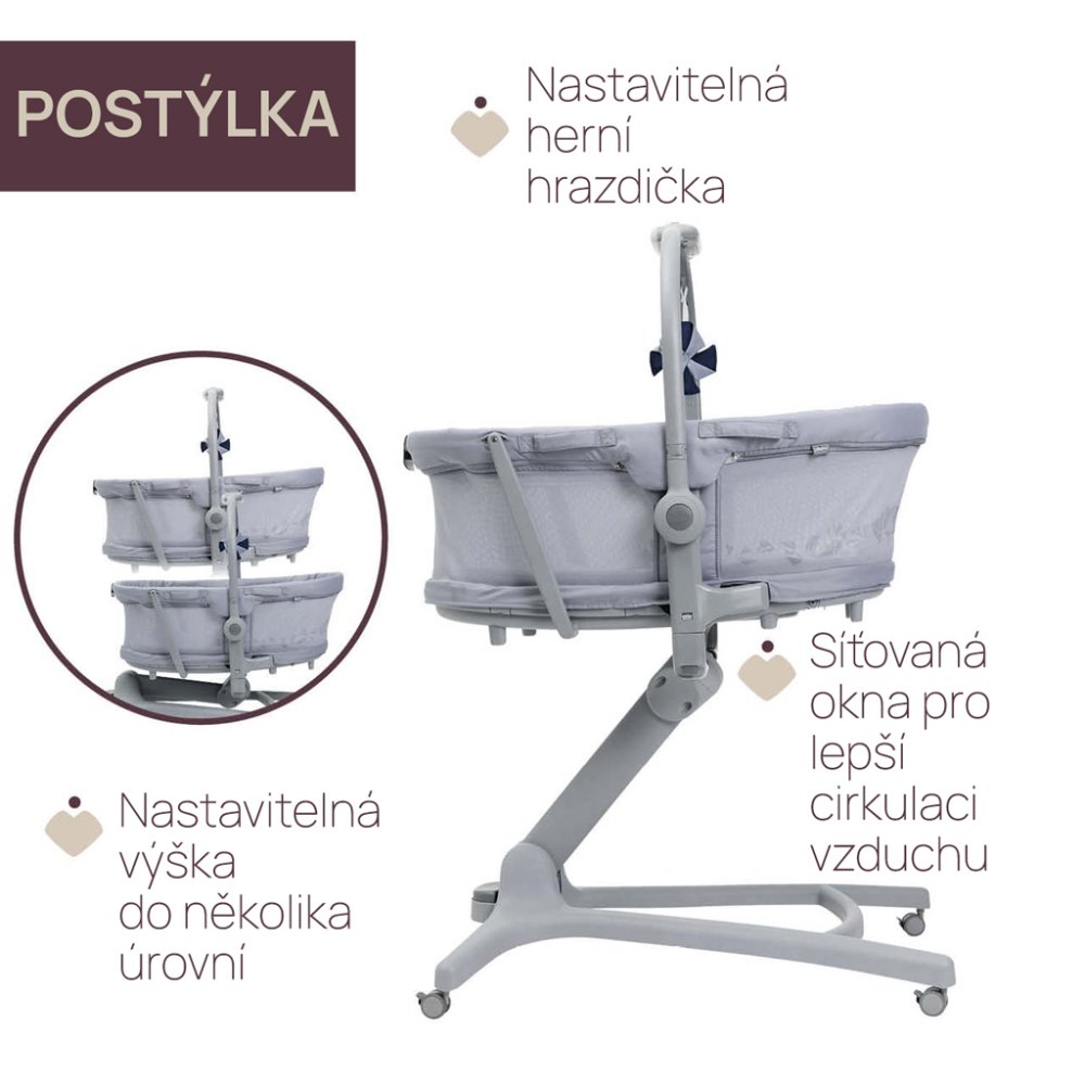 Multifunkční řešeníBaby Hug Pro 5v1 je nové řešení jak zvládnout všechny potřeby miminka na jednom metru čtverečním od narození do 36 měsíců.Chicco Baby Hug Pro 5v1 má 5 možností nastavení:- Postýlka na stojanu (0-6m) – ideální pro odpolední spánek či lenošení v postýlce.- Samostatně stojící postýlka (0-6m) – lze odmontovat od konstrukce – je to perfektní řešení pro přesouvání ve dvoupatrovém domě.- Křesílko (6-36m) – praktické křesílko pro poznávání světa kolem sebe v pohodlí a bezpečí.- Jídelní židle (6-36m) – výškově nastavitelná první židle pro společný čas jídla.- První křeslo – vlastní prostor pro hru či čtení knížky.Vlastnosti- Postýlku lze snadno odpojit od konstrukce a zvednout díky čtyřem úchytům.- Postýlku lze díky jejím protiskluzovým nožičkám položit i na hladkou podlahu.- Součástí je měkká, omyvatelná a odnímatelná redukční vložka pro nejmenší dětičky.- Síťovina po celém obvodu postýlky usnadňuje proudění vzduchu.- Je výškově nastavitelná s použitím jednoho pedálu.- Elektronická hrazdička se 3 stylovými závěsnými hračkami.- Nový textilní design na síťce dává Baby Hug Pro 5v1 nadčasový a moderní vzhled.- Pohodlná opěrka zad se dá sklopit do různých úrovní.- 4 praktická kolečka s brzdou pro snadné přemisťování.- Sedačka je pohodlná a bezpečná pro děťátko.- Potah je pratelnýRozměryDélka: 85 cmŠířka: 60 cmVýška: 88-122 cmVáha: 10,2 kgUPOZORNĚNÍ – UPOZORNĚNÍ: Pouze pro domácí použití. – UPOZORNĚNÍ: ODSTRANŇTE, ABYSTE PŘEDEŠLI NEBEZPEČÍ UDUŠENÍ PLASTOVÉ KRYTY PŘED POUŽITÍM VÝROBKU. TYTO KRYTY BY SE MĚLY ZNIČIT NEBO UCHOVAT PRYČ OD KOJET A DĚTÍ. – VAROVÁNÍ: Nedovolte jiným dětem hrát si bez dozoru v blízkosti produktu. – VAROVÁNÍ: Tento produkt a všechny jeho součásti musí být sestaveny pouze dospělou osobou. – VAROVÁNÍ: Nepřipojujte žádné šňůrky na prodloužení upevňovacího systému závěsné hračky hrazdičky a neprovádějte uzly/smyčky: může to způsobit nehodu kluzných uzlů, které by mohly způsobit uškrcení. – VAROVÁNÍ: Tento výrobek se smí používat pouze pod dozorem dospělých. – VAROVÁNÍ: Pravidelně kontrolujte, zda výrobek nevykazuje známky opotřebování a poškození. Pokud by nějaké části na hrazdě hraček resp. závěsné hračky se poškodí, nepoužívejte je a uschovejte mimo dosah dětí. – Dlouhodobé vystavení slunečnímu záření může způsobit zbarvení výrobku a může se lišit v tónu. Po delší expozici produktu na vysoké teplotě, několik minut počkejte před vložením dítěte do ní. – Ujistěte se, že dospělá osoba používající výrobek ví, jak to funguje, v souladu s pokyny výrobce. – Nikdy nepoužívejte výrobek bez krytu. – Nepoužívejte výrobek s více než jedním dítětem. – Nenechávejte na výrobku malé předměty, které by mohly spolknout děti. – Výrobek se smí otevírat, nastavovat a uzavřena dospělou osobou. – Výrobek vždy umístěte na vodorovný, stabilní povrch, když v něm sedí vaše dítě. – Výrobek nikdy neumisťujte do blízkosti schodů nebo schodů nebo na koberce. – Na rám výrobku nevěšte pytle ani závaží může to ovlivnit jeho stabilitu. – Neotevírejte a nezavírejte výrobek, když vaše dítě sedí v něm. – Před montáží se ujistěte, že výrobek a jeho komponenty nebyly během přepravy poškozeny. V tomto případě nepoužívejte a držte mimo dosah dětí. – Nepoužívejte jiné příslušenství ani náhradní díly než ty, které schválil výrobce. – Když se výrobek používá, kola musí vždy být zamčená. – Po odstranění postýlky ponechte rám mimo dosah dítěte. – Produkt uchovávejte mimo dosah dětí, když se nepoužívá. – UPOZORNĚNÍ: KDYŽ V KONFIGURACI postýlky, ZCELA UJISTĚTE SE, že ODSTRAŇTE BEZPEČNOSTNÍ PÁSY UCHOVÁVAJÍ SE MIMO DOSAHU VAŠEHO DÍTĚTE. – VAROVÁNÍ: Nepoužívejte tento výrobek bez přečtení návodu k použití. – UPOZORNĚNÍ: Výrobek je určen k používání dětmi ve věku 0 až 6 měsíců s hmotností maximálně 9 kg. – VAROVÁNÍ: Přestaňte výrobek používat hned, jak dítě může sedět nebo klečet nebo se vytáhnout. – VAROVÁNÍ: Umístění dalších položek do produktu může způsobit udušení. – Výrobek musí být vždy umístěn na vodorovný povrch. Nikdy nenechávejte výrobek na nakloněném povrchu s vaším dítětem uvnitř. – UPOZORNĚNÍ: Produkt je připraven k použití pouze tehdy, když je vše zapojeno blokovací mechanismy. Ujistěte se, že jsou před použitím bezpečně zajištěny. – VAROVÁNÍ: Dětskou postýlku nepoužívejte, je-li některá část zlomená, roztrhaná nebo chybějící. – UPOZORNĚNÍ: NEPOUŽÍVEJTE výrobek, pokud je jím jakákoli část chybí, je poškozený nebo zlomený. Kontaktujte Artsana SPA náhradní díly a v případě potřeby návod k použití. Chybějící, poškozené nebo zlomené části VYMĚŇTE za jiné komponenty nebo komponenty schválené společností Artsana SpA. – UPOZORNĚNÍ: Buďte si vědomi rizika popálenin od cigaret, otevřeným ohněm a jinými zdroji tepla, jako je elektřina nebo plynové ohřívače, které jsou v blízkosti postýlky. – Všechny komponenty musí být pevně připevněny na svém místě ; také se ujistěte, že nejsou žádné otevřené zipy jako části těla nebo oděv vašeho dítěte by se mohly zachytit je (šňůrky, náhrdelníky, řetízky na dudlíky atd.), které tvoří nebezpeč