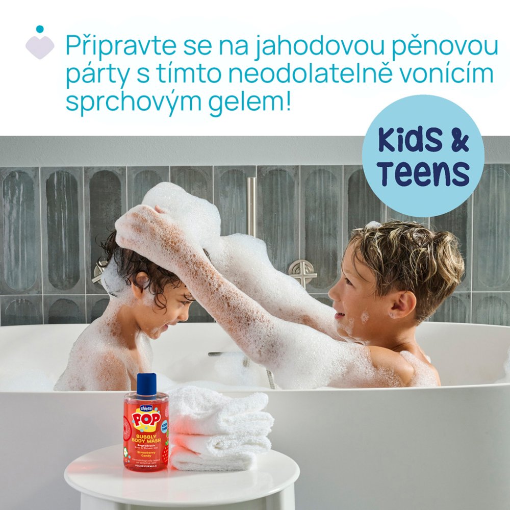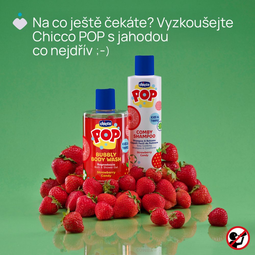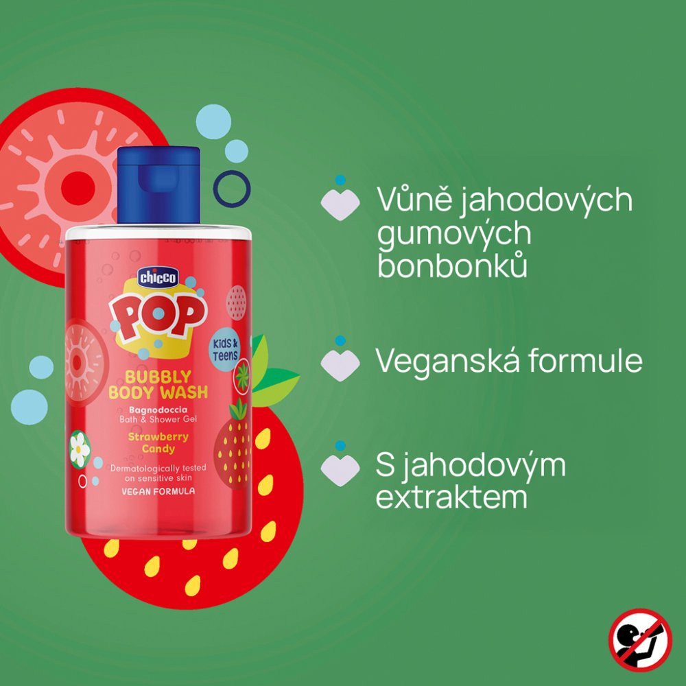 Proměňte každodenní sprchování v hravý a voňavý zážitek s Chicco POP sprchovým gelem Strawberry Candy.Objevte svět CHICCO POP – moderní dětské kosmetiky a teen beauty produktů, které mění každodenní péči na hravý self-care rituál. Tato stylová řada je navržena pro děti a teenagery, kteří milují zábavné vůně, trendy design a zároveň chtějí produkty šetrné k pokožce i životnímu prostředí. Kolekce spojuje svět beauty trendů s důrazem na jemné složení, veganskou formuli a dermatologicky testovanou péči.Sprchový gel s neodolatelnou vůní jahodových bonbonů promění každé mytí ve chvíle plné radosti a svěžesti. Jemná pěnivá textura šetrně čistí pokožku a zároveň vytváří bohatou pěnu, která zpříjemní každodenní rutinu.Hlavní výhody sprchového gelu Chicco POP:- jemný sprchový gel vhodný pro děti i teenagery- sladká vůně jahodových bonbonů pro hravý zážitek- obsahuje jahodový extrakt pro jemnou péči- bohatá pěna a příjemná textura- dermatologicky testováno – vhodné pro citlivou pokožku- 100% veganské složení bez složek živočišného původu- vhodný pro teen lifestyle- ideální pro moderní, vědomou kosmetickou rutinu- objem 300 ml- vyrobeno v ItáliiJemné složení, které si zamiluje dětská pokožka i rodiče: Sprchový gel Chicco POP Strawberry Candy je navržený s důrazem na maximální šetrnost a bezpečnost. Jeho složení kombinuje jemné mycí látky s pečujícími ingrediencemi, díky čemuž je ideální pro každodenní použití.Proč si zamilujete jeho složení?- Jemné mytí bez vysušování – kombinace šetrných mycích látek z kokosového oleje a moderních tenzidů účinně čistí pokožku, aniž by narušovala její přirozenou ochrannou bariéru.- Hydratace a hebkost – díky obsahu glycerinu zůstává pokožka po umytí jemná, vláčná a příjemná na dotek.- Přírodní dotek jahod – extrakt z jahod dodává pokožce pocit svěžesti a podtrhuje sladkou, hravou vůni celého produktu.- Vyvážené a šetrné složení – pečlivě zvolené ingredience a vyvážené pH respektují citlivou dětskou pokožku a jsou vhodné pro každodenní použití.Složení: Voda, kokosový síran sodný (jemná mycí složka z kokosového oleje), kokamidopropyl betain (šetrná čisticí složka), lauroylglutamát sodný (jemný tenzid), glycerin (hydratační složka), extrakt z jahod (Fragaria vesca), propanediol, propylenglykol, 1,2-hexandiol, glukonát sodný, benzoan sodný, sorban draselný, parfemace, kyselina citronová, barvivo CI 16035.Použití: Naneste malé množství gelu na vlhkou pokožku, napěňte a poté důkladně opláchněte.Upozornění: Pouze k vnějšímu použití. Uchovávejte mimo dosah malých dětí.Dodavatel:ARTSANA SPA, Via S. Catelli 1-22070, Grandate (CO), Itálie, www.chicco.com, +39 800 188 1755.