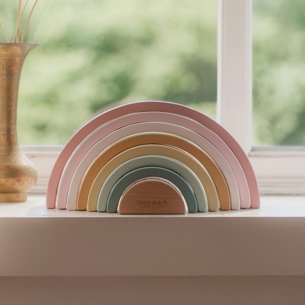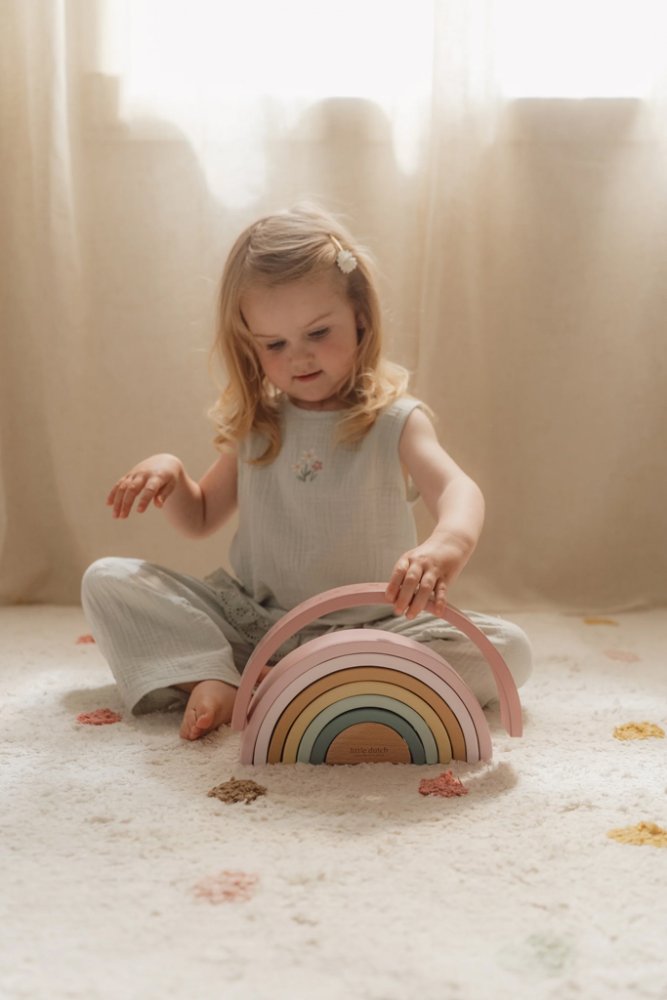 Přeneste duhu z oblohy do dětského pokoje! Krásná dřevěná skládačka ve tvaru duhy umožní dětem používat svou představivost k vytváření různých tvarů. Dokáže s její pomocí postavit například železniční tunel, domeček pro malé panenky nebo most pro auta. Možností je nekonečně mnoho! Skládačka je součástí designové kolekce hraček a doplňků Little Dutch Fairy Garden inspirované životem v zahradě. Vyrobeno ze dřeva certifikovaného FSC. Rozměry: 23,5 cm x 11,5 cm x 5 cm Vhodné pro děti od 12 měsíců.