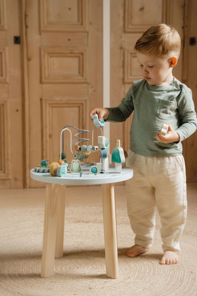 Dřevěný multifunkční stolek v krásném vysoce kvalitním provedení nabízí vašemu dítěti spoustu různorodých aktivit, které dítě zabaví a zároveň pomáhají rozvíjet jeho jemnou motoriku i jednotlivé smysly. Lákat dítě ke zkoumání budou pohyblivé, posuvné i odnímatelné dřevěné díly v podobě ježka, šneka, žáby, hříbků a dalších motivů ze života v lese. Díky stabilnímu dřevěnému provedení je stoleček vhodný i pro děti, které hledají oporu při prvních krůčcích. Stoleček je součástí designové kolekce hraček a doplňků Little Dutch Forest Friends inspirované životem v lese. Vyrobeno ze dřeva certifikovaného FSC. Rozměry: 39 cm x 39 cm x 54 cm Vhodné pro děti od 12 měsíců.