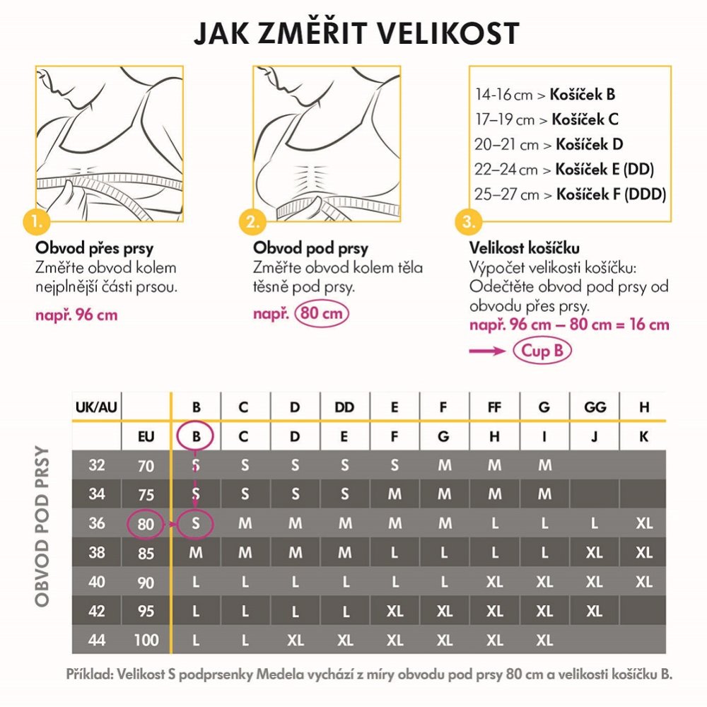 Odsávání a kojení v naprostém pohodlí s podprsenkou pro kojení a odsávání Medela. Díky všestrannému designu 3v1 je lehká, mimořádně prodyšná a je vybavena technologií Adaptive Stretch™ pro dokonalé přizpůsobení.Tato podprsenka 3v1 je určena pro:- in-bra odsávání- elektrické odsávačky mateřského mléka- kojeníVýhody podprsenky pro kojení a odsávání Medela 3v1Podprsenka Medela 3v1 pro kojení a odsávání vám pomůže nakrmit nebo odsát mléko pro vaše dítě v naprostém pohodlí.- Středně vysoká až vysoká opora, která udrží lahvičky a odsávačku v podprsence na svém místě- Jednoduché odsávání bez pomoci rukou- Lehká, pohodlná a prodyšná díky perforovaným pěnovým vycpávkám a materiálu příjemnému na dotek- Jemný materiál s technologií Adaptive Stretch™ pro dokonalé přizpůsobení, který roste s vaším měnícím se tělem- Plně padnoucí košíčky, abyste si během kojení mohli užívat maximální kontakt a navázat tak s miminkem lepší pouto- Vhodný pro většinu elektrických odsávaček mateřského mléka a in-bra odsávaček- K dispozici v černé, bílé a béžové barvě ve velikostech S-XL pro skvělou podporu a dokonalé přizpůsobení Nádoba na mléko uložena přímo v podprsence. Dostupné barvy se mohou lišit a mohou se měnit.Díky této praktické podprsence je odsávání velmi snadné. Její praktický design je vhodný pro většinu prsních nástavců a in-bra odsávaček.Je také mimořádně prodyšná díky perforovaným pěnovým vycpávkám a je vybavena technologií Adaptive Stretch™ pro dokonalé přizpůsobení a maximální pohodlí.Materiál je certifikován podle normy Oeko-Tex® Standard 100 a lze jej prát v pračce až na 60 °C.Materiál: 94 % nylon, 6 % elastanDodavatel:Bravado Designs Ltd. 60 Scarsdale Road,Unit 100,Toronto, Ontario M3B 2R7,Canada,www.medela.com, 400-670-3600