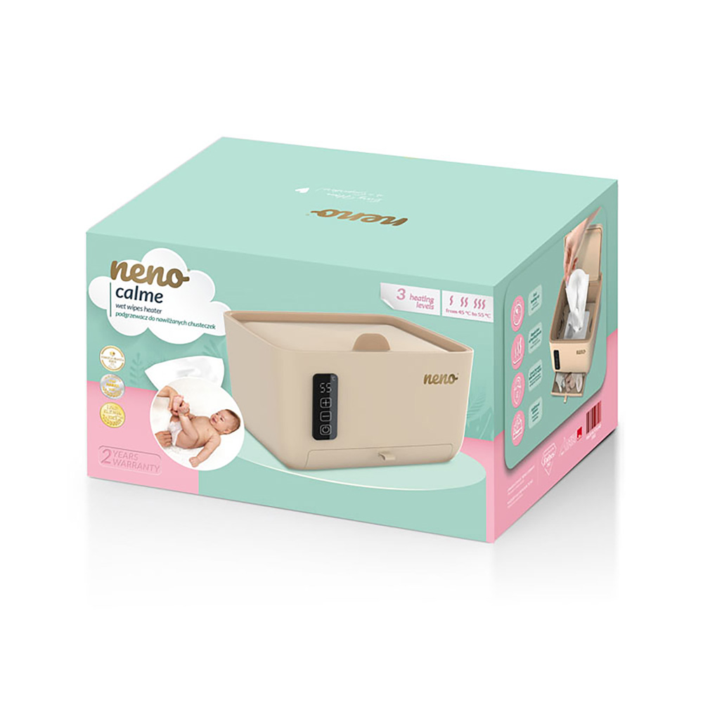 Zajistěte svému miminku maximální pohodlí při každé výměně plenky! Neno Calme je inteligentní ohřívač vlhčených i suchých ubrousků, který zajišťuje příjemnou teplotu a vlhkost, a tím chrání citlivou dětskou pokožku před tepelným šokem a podrážděním. Neno Calme je inteligentní ohřívač vlhčených i suchých utěrek, který zaručuje příjemnou teplotu a vlhkost, čímž chrání citlivou dětskou pokožku před tepelným šokem a podrážděním.Vlastnosti:- Tři úrovně ohřevu – zvolte si teplotu 45°C, 50°C nebo 55°C podle aktuální potřeby- Ochrana před vysycháním – utěrky zůstávají vlhké a svěží po celý den- Praktická zásuvka – vhodná i na suché utěrky, dětské ponožky či obklady- Magnetické víčko s těsněním – udržuje teplo a snižuje energetické ztráty- Jednoduché vyjímání utěrek – víčko brání vytažení celého balení najednou- Elegantní design – dokonale zapadne do dětského pokoje, koupelny i obývacího pokoje- Tichý chod – neruší miminko během spánku- Rychlý ohřev – utěrky jsou připraveny během chvilky- Dotykový panel – jednoduché a bezpečné ovládání- Ochrana proti nechtěnému zapnutí – aktivace podržením tlačítka- Protiskluzová základna – stabilita na každém povrchu- Dvoustranný ohřev – utěrky se zahřívají shora i zdola pro rovnoměrnou teplotu- Dlouhý napájecí kabel – až 170 cm pro snadné umístění kdekoliObsah balení:- Ohřívač vlhčených utěrek Neno Calme- Návod k použitíTechnické parametry:- Teploty ohřevu: 45°C, 50°C, 55°C- Napájení: AC 220–240V, 28W, 50–60Hz- Délka kabelu: 170 cmRozměry produktu: 24 × 15,5 × 18,3 cmDůležité: Před použitím si prosím pečlivě přečtěte pokyny. Výrobek nevkládejte do vody. Nevkládejte jej do parního sterilizátoru za účelem dezinfekce. Neumisťujte výrobek na místa dostupná dětem. Po použití vždy odpojte zařízení z elektrické sítě. Pokud je výrobek poškozený, nerozebírejte ho sami – obraťte se na autorizovaný servis. Zařízení mohou používat děti od 8 let a osoby se sníženou fyzickou, smyslovou nebo mentální schopností pouze pod dohledem nebo po důkladném poučení o bezpečném používání. Děti si se zařízením nesmí hrát. Čištění a údržbu nesmí děti provádět bez dozoru. Výrobek není hračka. Zařízení je určeno výhradně pro domácí použití nebo použití v obdobném prostředí (např. kanceláře, hotelové pokoje apod.).Adresa výrobce: KGK Trend sp., ul. Ujastek 5b, 31–752 Kraków, Poland