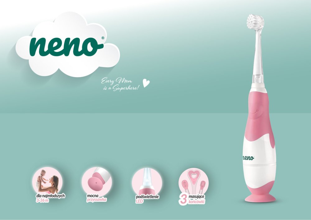 Elektrický zubní kartáček Neno Denti pro dětičky se dodává se čtyřmi vyměnitelnými hlavicemi, které umožňují přizpůsobit kartáček věku a potřebám děťátka.Kartáček určený pro jemné dětské zoubky. Postarejte se o to, aby byl úsměv vašeho děťátka krásný a zdravý.Přísavka- Když svému děťátku zrovna nečistíte zoubky, můžete kartáček Neno Denti nechat ve vertikální poloze. Speciální přísavka udrží zubní kartáček na místě.Pro nejmladší- Lze použít ik péči o dětičky bez zoubků. Neno Denti se dodává se speciální hlavicí, která se používá k masáži dásní dětiček starších 3 měsíců.Zdravé návyky- Není to jen zubní kartáček – je to celá souprava pro ústní hygienu. Udržujte zuby děťátka zdravé a naučte jej návyku pravidelného čištění zoubků.Světýlko- Led světlo zubního kartáčku vám umožní vidět na zoubky vašeho děťátka. Světlo navíc vaše děťátko jistě zaujme a promění každodenní čištění zubů ve zcela nový způsob hry.Atraktivní design- Zubní kartáček Denti má tvar tučňáka, díky čemuž je pro dětičky atraktivní.Vodě-odolná- má stupeň vodotěsnosti IPX7, díky čemuž je odolná vůči vodě. Lze ji čistit pod tekoucí vodou. Tento elektrický zubní kartáček je naprosto bezpečný pro používání v koupelně.Vlastnosti- Pracovní režim: jemné vibrace, 17 000 za minutu- Vestavěný časovač: 2 minuty čištění, krátká pauza každých 30 sekund- 4 různé nástavce na: čištění zubů, masáž dásní, čištění jazyka, čištění mezer mezi zuby- Štětiny: měkké, nylonové- Pracovní doba na jednu baterii: až 150 dní- LED světélko, které vám umožní jasně vidět zuby a dásně- Napájení: 1× AAA baterie (není součástí balení)- Vodotěsnost: IPX7- Obsah balení: zubní kartáček, 4 kartáčkové nástavce- Rozměry 149×28×28 mm- Hmotnost: 28 g (bez baterie)- Doporučený věk: 3-36m1. Pokud nerozumíte návodu k použití nebo bezpečnostním opatřením uvedeným v tomto dokumentumanuál, zařízení nepoužívejte. Nesprávné použití zařízení může způsobit jeho poškození.2. Výrobek nerozebírejte. To může vést k poškození výrobku,úrazu elektrickým proudem a ztrátě záruky.3. Nepoužívejte jiné příslušenství, než které doporučuje výrobce.4. K čištění produktu nepoužívejte hořlavé nebo výbušné látky.5. Tento produkt se používá pouze k čištění zubů a masáži dásní. Nepoužívejtezařízení pro jakýkoli jiný účel.6. Pokud je zařízení zjevně poškozené, přestaňte jej používat.7. Neponořujte výrobek do vody. To může vést k poruše amůže způsobit požár, úraz elektrickým proudem nebo výbuch.8. Udržujte zařízení mimo dosah nádob s vodou, jako je vana nebo dřez.9. Nevyměňujte baterii zařízení, pokud máte mokré ruce.10. V zařízení nepoužívejte použité, staré baterie.11. Při vkládání baterie do zařízení dávejte pozor na póly baterie.12. Neumisťujte zařízení do místností s vysokou vlhkostí nebo vysokými teplotami,jako jsou koupelny.13. Vyjměte baterii ze zařízení, pokud jej nebudete delší dobu používatpo určitou dobu, aby se zabránilo riziku požáru. 14. Pokud použitá zubní pasta obsahuje peroxidy nebo hydrogenuhličitan (často přítomnév pastách na bělení zubů), po použití zařízení důkladně umyjte, abyste se vyhnulizničit jeho plastový obal.15. Pokud používání zařízení způsobuje vašemu dítěti nepohodlí nebo krvácení z dásní,před dalším používáním se poraďte se svým zubním lékařem.16. Děti mohou spotřebič používat pouze pod dohledem dospělých, kteří četlinávod k obsluze.17. Zařízení není hračka – uchovávejte jej mimo dosah dětí, aby ho nepoužívalya to bez dohledu dospělé osoby.18. Zařízení se používá pro osobní hygienu a nemělo by být používáno u mnoha lidí v zubních ordinacích.Adresa výrobce: KGK Trend sp. z o.o., ul. Ujastek 5b, 31-752 Kraków, Poland. info@kgktrend.pl, NIP 678 315 51 46