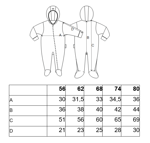 Overal je určený na nošení doma, do kočárku nebo do autosedačky. Skvěle padne na každý typ postavy, nevytahá se a přizpůsobí se více velikostem. Overal má kapuci a zapíná se na zip. U krčku má našitou krytku zipu proti poškrábání. Na rukávech je našitý široký náplet, kterým můžete regulovat délku rukávů. Nohavice jsou zakončeny ťapkami, proto je overal určen především pro ještě nechodící děti.