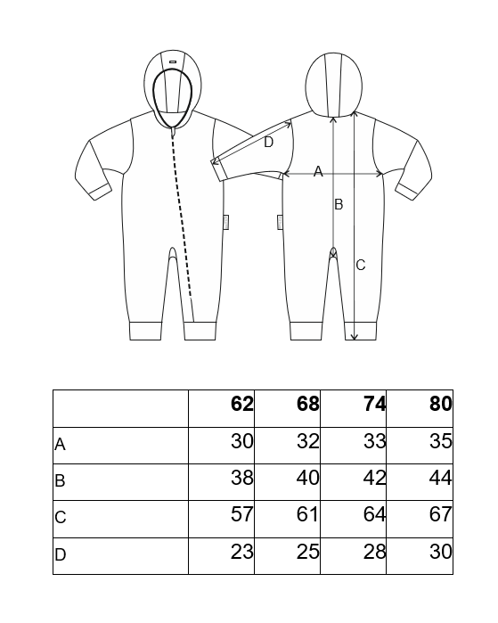Overal je určený na nošení doma, do kočárku nebo do autosedačky. Skvěle padne na každý typ postavy, nevytahá se a přizpůsobí se více velikostem. Overal má kapuci a zapíná se na zip. U krčku má našitou krytku zipu proti poškrábání. Je doplněn o reflexní logo ve tvaru hvězdy na koženkovém logu. Na rukávech i nohavicích je našitý široký náplet, kterým můžete regulovat délku.
