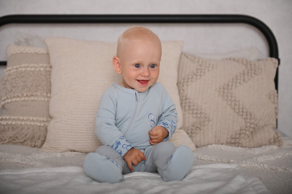 Pohodlný dětský overal z bavlněného úpletu a termoregulačního materiálu Outlast®. Overal má dupačkové nohavice. Rukávy jsou dlouhé a mají široké náplety, které můžete v případě potřeby ohrnout a upravit tak délku rukávů podle aktuální potřeby. Overal se zapíná na dlouhý zip, který usnadní oblékání. Po zapnutí lze jezdec zipu schovat do speciální krytky pod bradou, a zabránit tak otlačení brady. Přední stranu overalu zdobí potisk s motivem zvířátka. Overal má uvnitř nažehlené etikety, které netlačí a nadráždí jemnou dětskou pokožku.