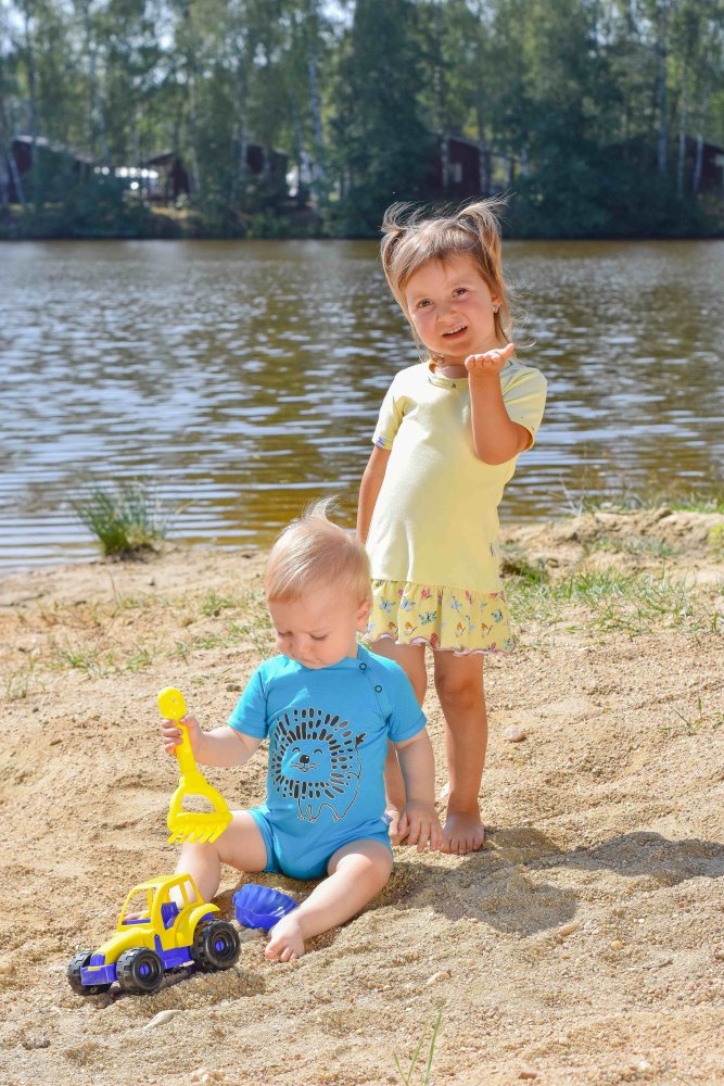 Díky pružnosti materiálu overal krásně přiléhá na tělíčko a nikde neodstává. Zapíná se na druky, které jsou umístněny na jedné straně u krčku a v rozkroku pro snadné přebalování.