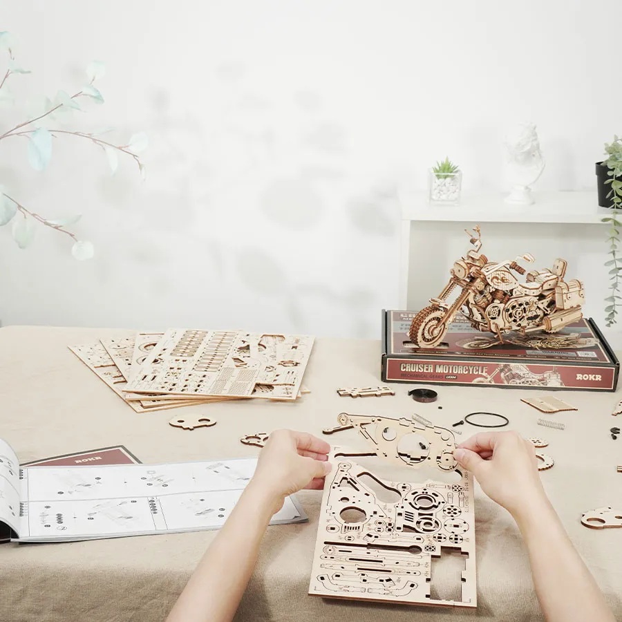 Stavebnice těžkého cestovního motocyklu vyrobená z překližky, je určená všem, kdo sní o bezstarostné jízdě divokým západem. Model je vybaven natahovacím pružinovým strojkem vybaveném spouští, díky němuž je schopen svižné jízdy. Směr je možno částečně ovládat nastavením funkčních řídítek a chod motoru je přitom poutavě ztvárněn pohybem pístů. Motorka zaujme i dalšími funkčními mechanickými podrobnostmi, odpružením vidlice předního kola, či stojanem, s jehož pomocí dovedně zkrášlí poličku, či stůl ve Vašem pokoji, nebo kanceláři. Po obou stranách sedla je vybavena užitečnými skříňkami, které poslouží hrám, ale je možno do nich uložit i drobnou cennost, nebo vzkaz. Skládačka je dodávána v nesloženém stavu, balena v krabici. Vybaveno detailním návodem k sestavení. Hlavní vlastnosti:420 precizně vyřezaných dílkůstřední obtížnost sestavenívýsledný model je řiditelný a schopný samostatné jízdydrobný úložný prostor