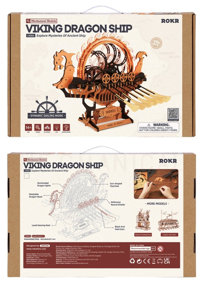 Přeneste se do historie s modelem Dračí lodě inspirovaným starými vikingskými plavidly zvanými drakkar, což znamená drak. Věřilo se, že drak chrání námořníky během plavby. Dlouhá, úzká konstrukce lodí umožňovala rychlost a hbitost v manévrování. Vikingové jsou známí hlavně jako divocí nájezdníci nebo dobyvatelé. Tato složitě navržená plavidla ale odhalují jejich pokročilé dovednosti ve stavbě lodí a jejich schopnost plavit se na obrovské vzdálenosti. Skládačka je vybavena mechanismem, který zajišťuje synchronizovaný rotační pohyb všech vesel. Nad celou lodí prochází prosvětlená plastová dračí páteř, která je výraznější díky třpytivému efektu a syté barvě. Skládačka umožňuje užít si kreativní a edukativní hraní a zároveň vytvořit nádherný model s LED osvětlením, který se může stát netradičním dárkem či ozdobou interiéru. Skládání 3D skládačky podporuje rozvoj jemné motoriky, prostorového myšlení a trpělivosti. Pozvěte svou rodinu nebo přátele a užijte si zábavné tvoření bez nutnosti použití lepidla nebo nástrojů. Všechny díly skládačky jsou přesně vyřezané a očíslované a lehce do sebe zapadnou, aby výsledek byl stabilní a odolný. Skládačka je dodávána v nesloženém stavu, zabalená v krabici s podrobným návodem k sestavení a k napájení slouží USB-C kabel (není součástí balení). Hlavní vlastnosti: 229 dílkůdoba skládání 4 hodstřední obtížnost sestavenírozvíjí logické a motorické dovednostisnadná montáž bez použití lepidla a nástrojůpodporuje trpělivost dětíideální jako dárek nebo jedinečná dekoracepodrobný návod k sestavení součástí balenínapájecí kabel USB-C není součástí baleníLED osvětlení