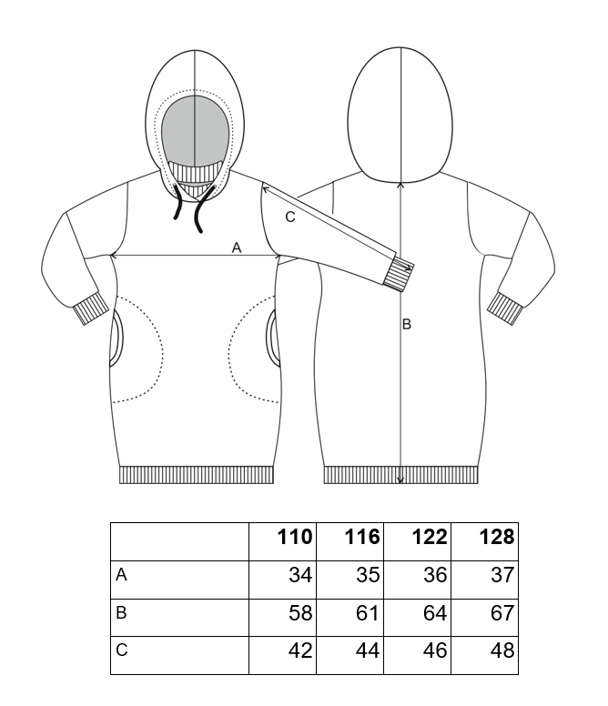 Díky kapuci a kapsám působí ležérně. Moderní módní kousek je obohacen o stuhy na rukávech a bocích, které dodají šatům šmrnc. Podšitá kapuce je doplněna o nefunkční saténovou šňůrku. Z důvodu bezpečnosti nelze šňůrka zatáhnout.
