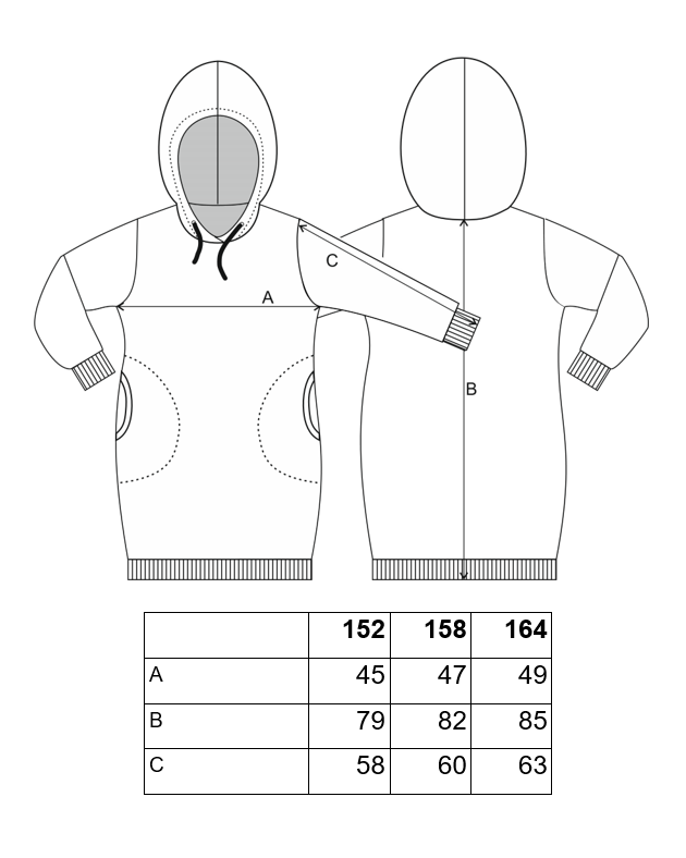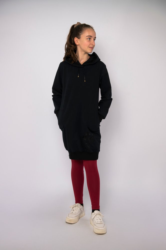 Díky kapuci a kapsám působí ležérně. Moderní módní kousek je obohacen o výšivky, které dodají šatům šmrnc. Podšitá kapuce je doplněna o saténovou šňůrku.