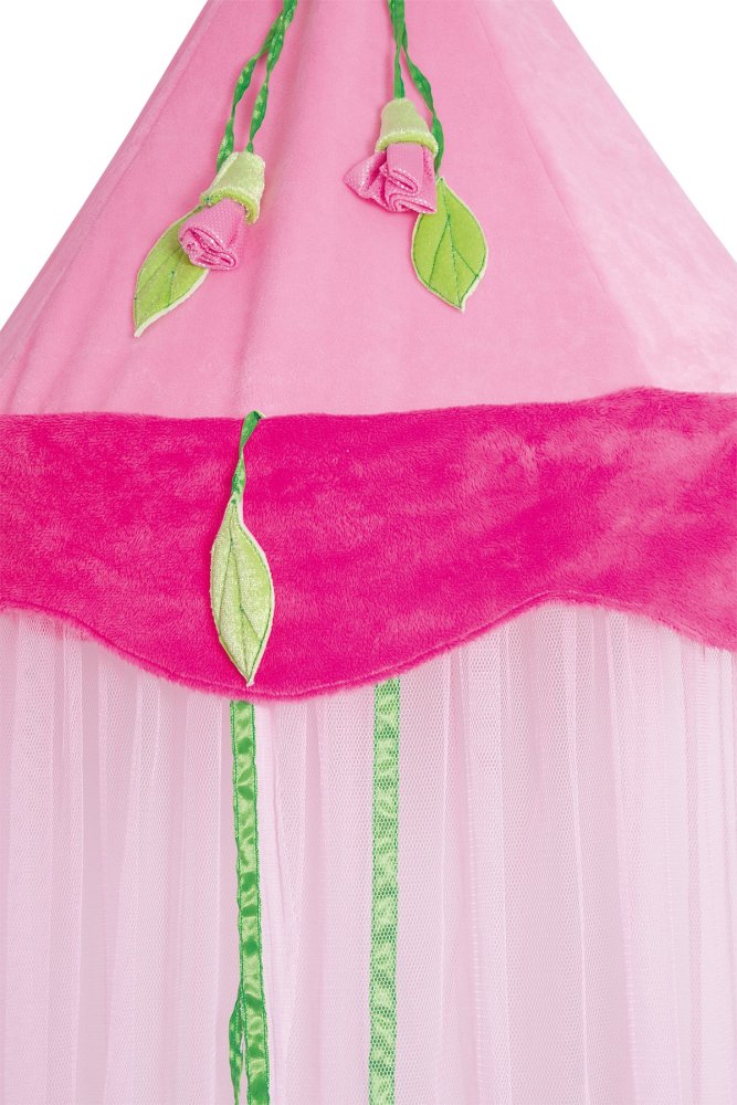 Tento růžový baldachýn promění každou postýlku v oázu snů. Stříška je zdobená plyšovými okraji a květinami růží z látky. Malým princeznám vykouzlí zákoutí ke hře či odpočinku. Baldachýn lze v létě použít jako moskytiéru. Hlavní vlastnosti: baldachýn zdobený růžemipoutko na zavěšení