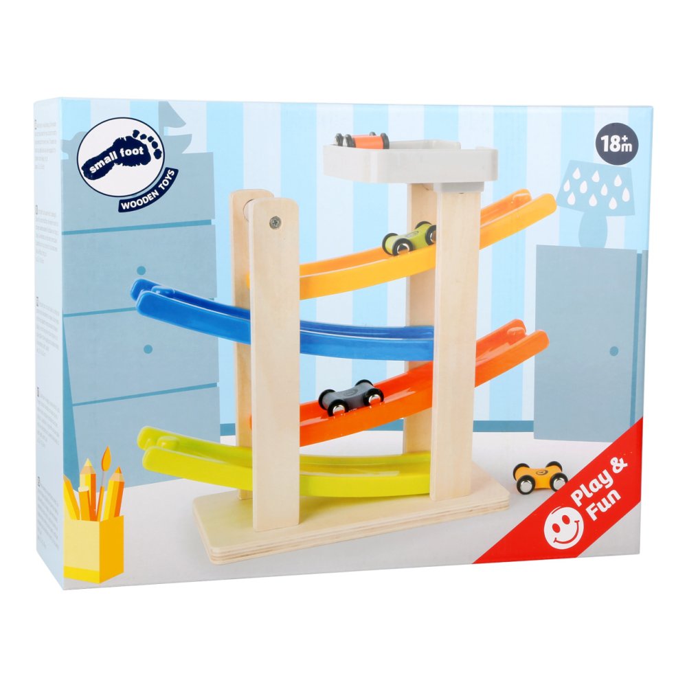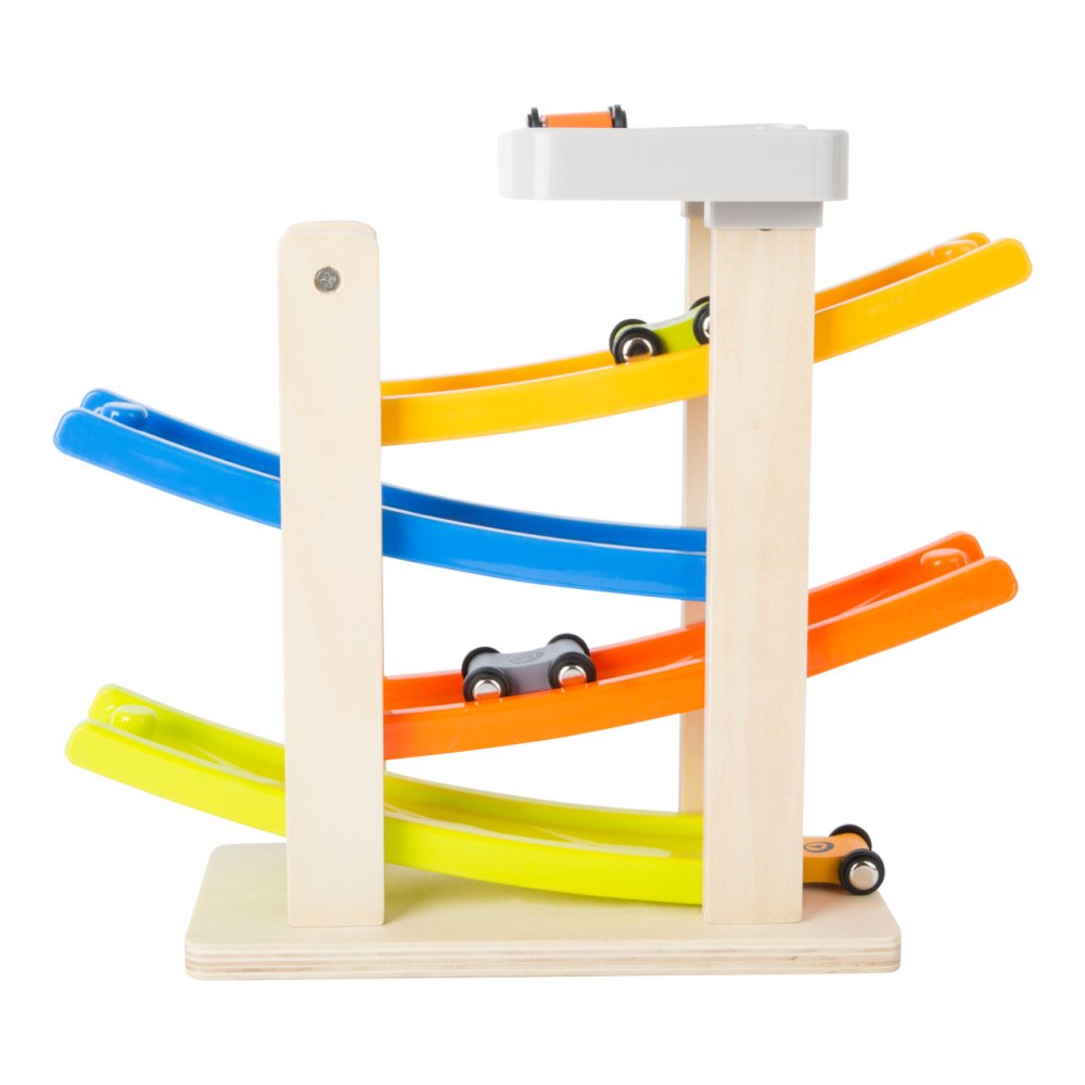 A teď se závod doopravdy rozjíždí! Tato dřevěná závodní auta se řítí po čtyřech rampách a provádějí dechberoucí salta. Dřevěná závodní dráha má stabilní základnu a je dobře vybavená do dětského pokoje. Připravit, nastavit, vyrazit! Hlavní vlastnosti: moderní barevné provedenírozvíjí hravým způsobem motoriku