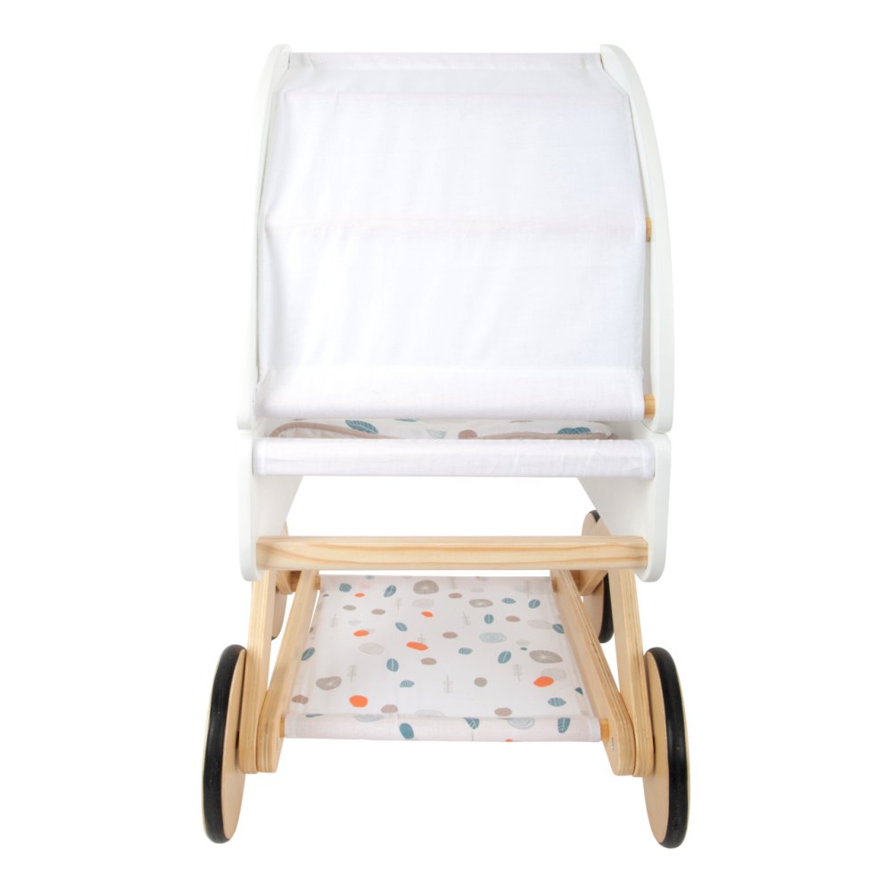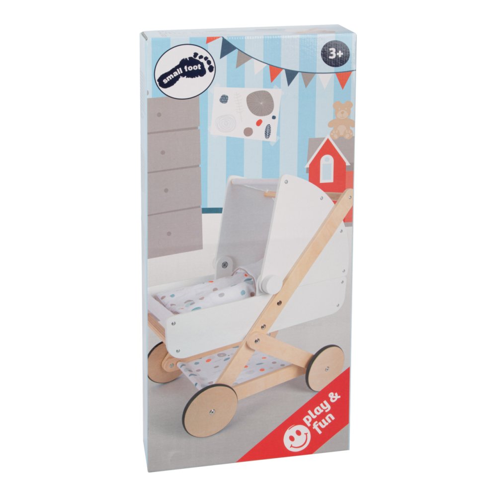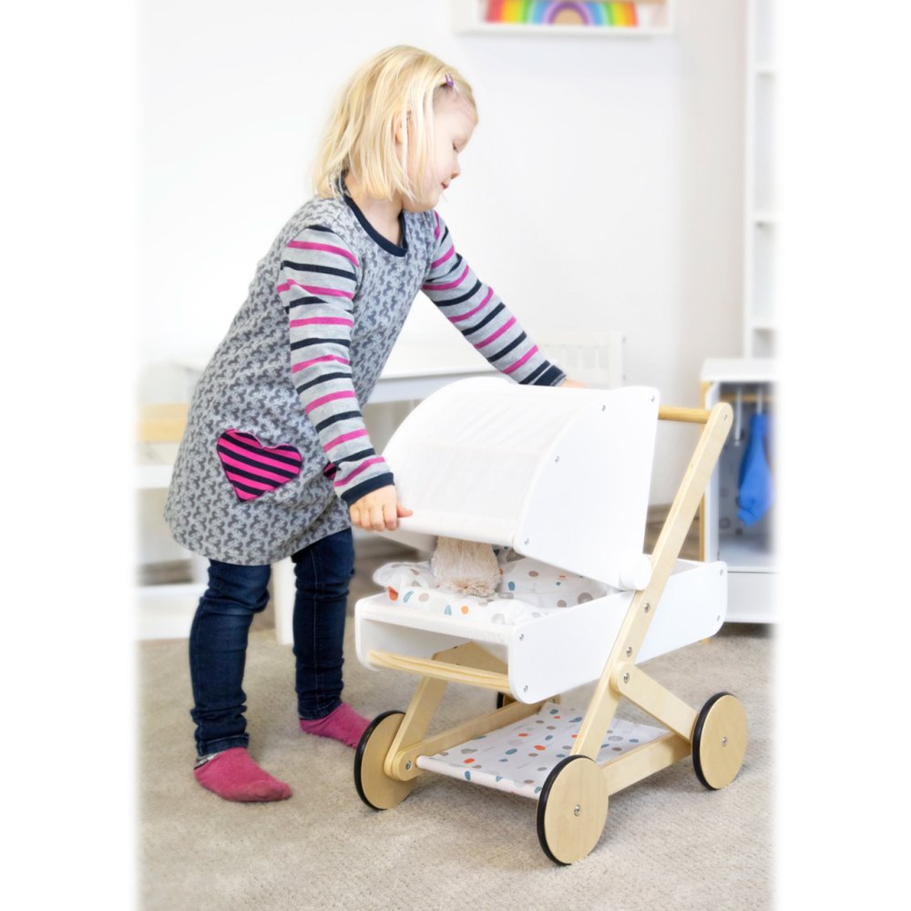 Pro panenky, plyšáky a jejich kamarády jen to nejlepší! Tento moderní kočárek pro panenky na vás udělá dojem svým jemným, lineárním skandinávským designem a také úložným prostorem pod lehátkem. Díky odklápěcí stříšce mohou panenky a plyšáci z kočárku koukat dopředu nebo dozadu. Oboustranné a genderově neutrální povlečení s peřinou nadměrné velikosti zajistí, že panenky a plyšáci do 46 cm budou v pohodlí. Kočárek má tichá pogumovaná kolečka. Moderní kočár s prvky z přírodního dřeva, s omyvatelným textilem jen čeká kdo se v něm sveze! Je velmi stabilní i při své nízké váze, hodí se do každého pokoje a to díky svému neutrálnímu designu. Hlavní vlastnosti: 2v1: Díky odklápěcí stříšce se mohou panenky a plyšáci dívat dopředu nebo dozaduPraktický úložný prostor pod lehátkemPogumovaná kolečka pro tichou a bezpečnou jízduStabilní konstrukce i při nízké vázeVhodné pro panenky a plyšáky do 46 cmZaoblené hrany a viditelně dřevěné prvkyOboustranné genderově neutrální povlečení, peřina nadměrné velikostiSkandinávský design, paleta jemných barev, prvky ze série „Little Button“ Little Button Řada atraktivního příslušenství pro panenky Little Button nabízí pestrou paletu výrobků, od kočárku přes jídelní židličku až po skříň. Zákazníky snadno zaujmou jednotným funkčním a decentním designem využívajícím přímé linie a střídmé neutrální barvy. Díky tomu spolu mohou vytvořit ucelené harmonické soupravy, které vkusně doplní moderní interiér. Důmyslná konstrukce a kvalitní zpracování pomáhají zajistit vysokou stabilitu, bezpečnost a dlouhou životnost. Založte s jejich pomocí stylový koutek pro panenky, kde mohou Vaše děti rozvíjet svou fantazii a pečovatelské dovednosti.