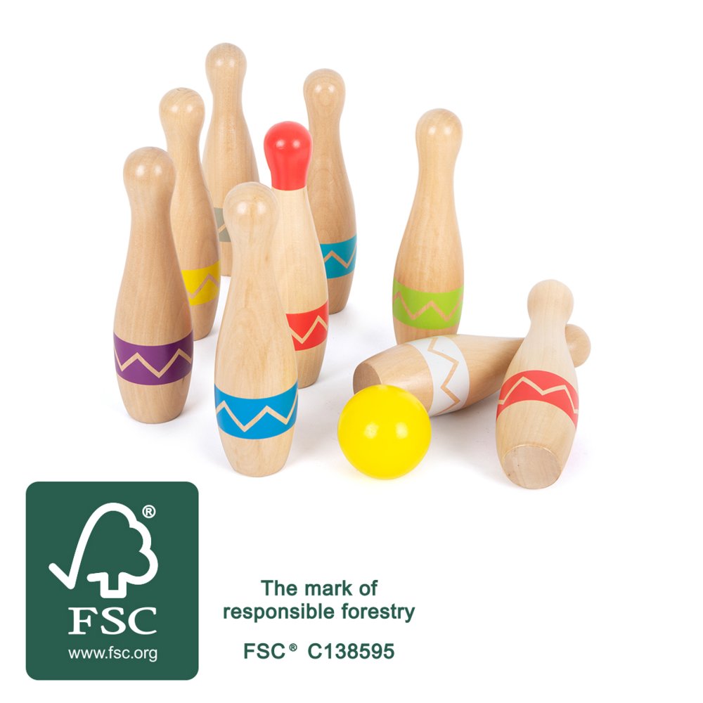 Kdo shodí všech devět kuželek? Tento set je vyroben ze 100% certifikovaného FSC® dřeva, zábavná hra pro všechny věkové kategorie! Devět kuželek je vyrobeno z pevného dřeva v moderním „Active“ designu, dvě dřevěné koule mají velikost tak akorát pro děti. Kuželky jsou vhodné do vnitřních i venkovních prostor. Kuželkový set je uložen v textilním pytlíku s poutky, můžete si jej tak vzít kamkoliv s sebou. Díky moderním barevným potiskům kuželky jednoduše uvidíte i v trávě a z větší dálky. Kdo má nejpřesnější mušku? Hlavní vlastnosti: kuželky z přírodního dřeva s barevným potiskemdvě barevné koulebavlněný pytlík s poutky Značka a certifikát FSC® (Forest Stewardship Council) zaručuje, že dřevo, ze kterého byl produkt vyroben, nebylo vytěženo nelegálně a pochází z lesů obhospodařovaných šetrným či přírodě blízkým způsobem, ve kterém jsou dodržovány přísné environmentální a sociální požadavky. Značka FSC® na výrobku znamená, že svým nákupem pomáháte chránit lesy a podporujete šetrné, odpovědné či přírodě blízké hospodaření, díky kterému jsou naše lesy stabilnější, zdravější, mají přirozenou druhovou skladbu a lépe odolávají negativním následkům klimatických změn.