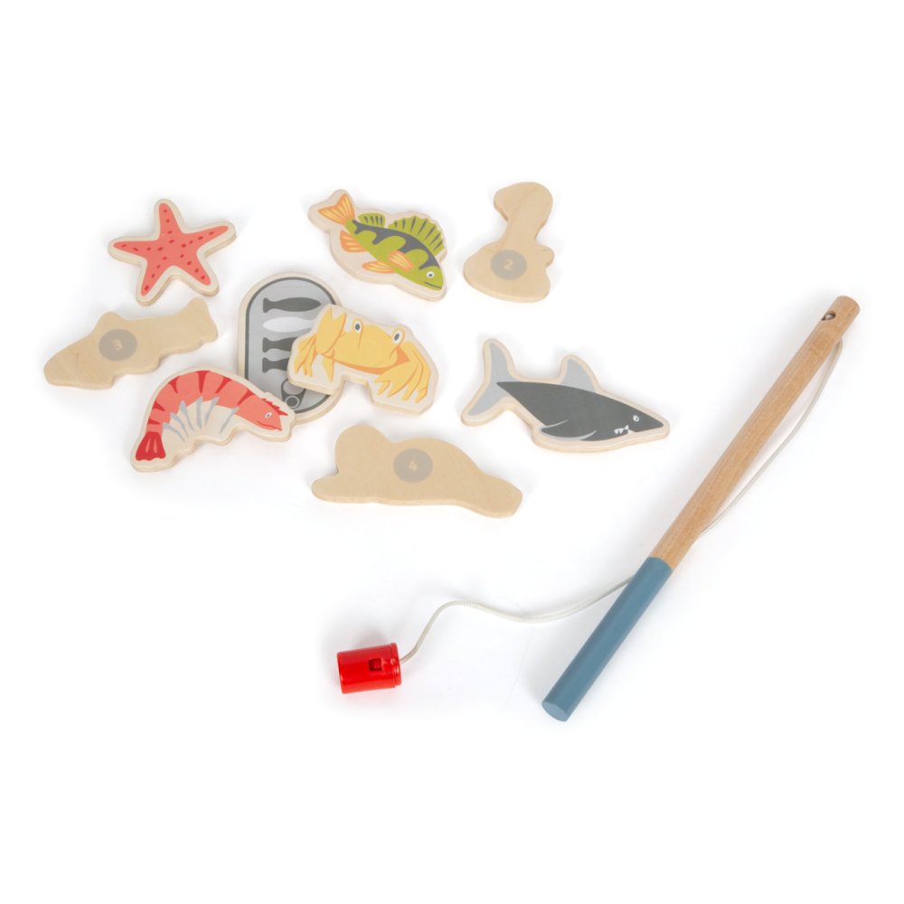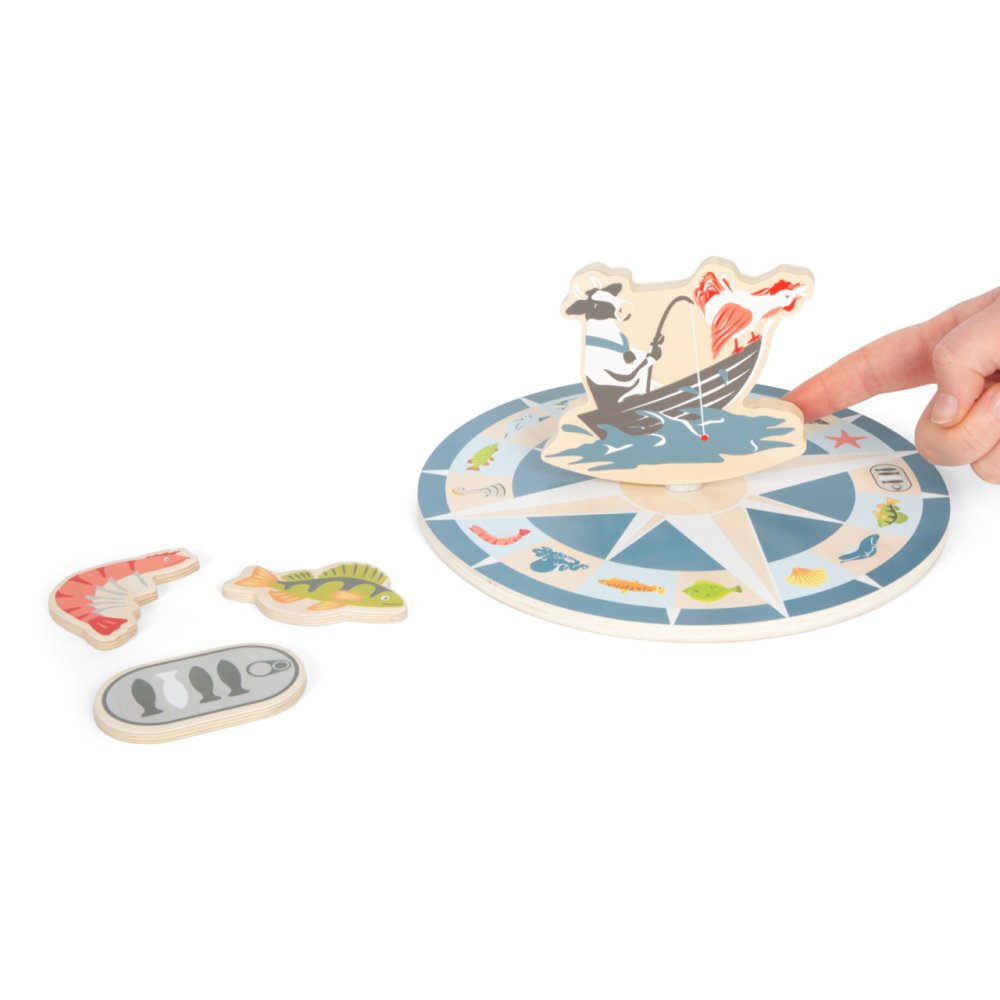 Vydejte se na moře rybařit s roztomilými zvířátky! Roztočte střelku kompasu, a vylosujte si tím mořského tvora, kterého máte ulovit. Chytáním magnetickou udičkou rozvíjejte jemnou motoriku a trpělivost, a to až se třemi přáteli, nebo v kruhu rodiny! Dílky hry jsou vyrobeny z odolné překližky a spolu s udičkami jsou uloženy v praktické, barevně ilustrované kartónové krabičce, která zároveň slouží jako hrací plocha. Hlavní vlastnosti:4 udičky, 16 herních dílků a 3 díly doplňkůpraktické balení