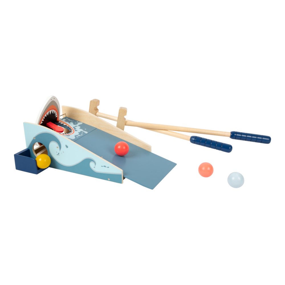 Vyšlete míček po obří vlně do žraločí tlamy ve vzrušující minigolfové hře! Na své si při ní přijdou fanoušci sportu i přírody. Pokud hráč míčkem trefí žraločí tlamu, hrozivé čelisti sklapnou a on efektně skóruje. Bok atrakce je vybaven otvorem, kterým jsou spolknuté míčky vraceny zpět do hry. Díky sadě holí a míčků snadno zabaví skupinku dětí, a to i v pokoji během deštivých dní. Všechny součásti jsou vyrobeny z pevné a odolné kombinace překližky a masivního dřeva. Hlavní vlastnosti:jamka s překážkou, 2 hole a 4 míčkyefektní atrakce vybízející k pohybuodolné dřevěné provedení