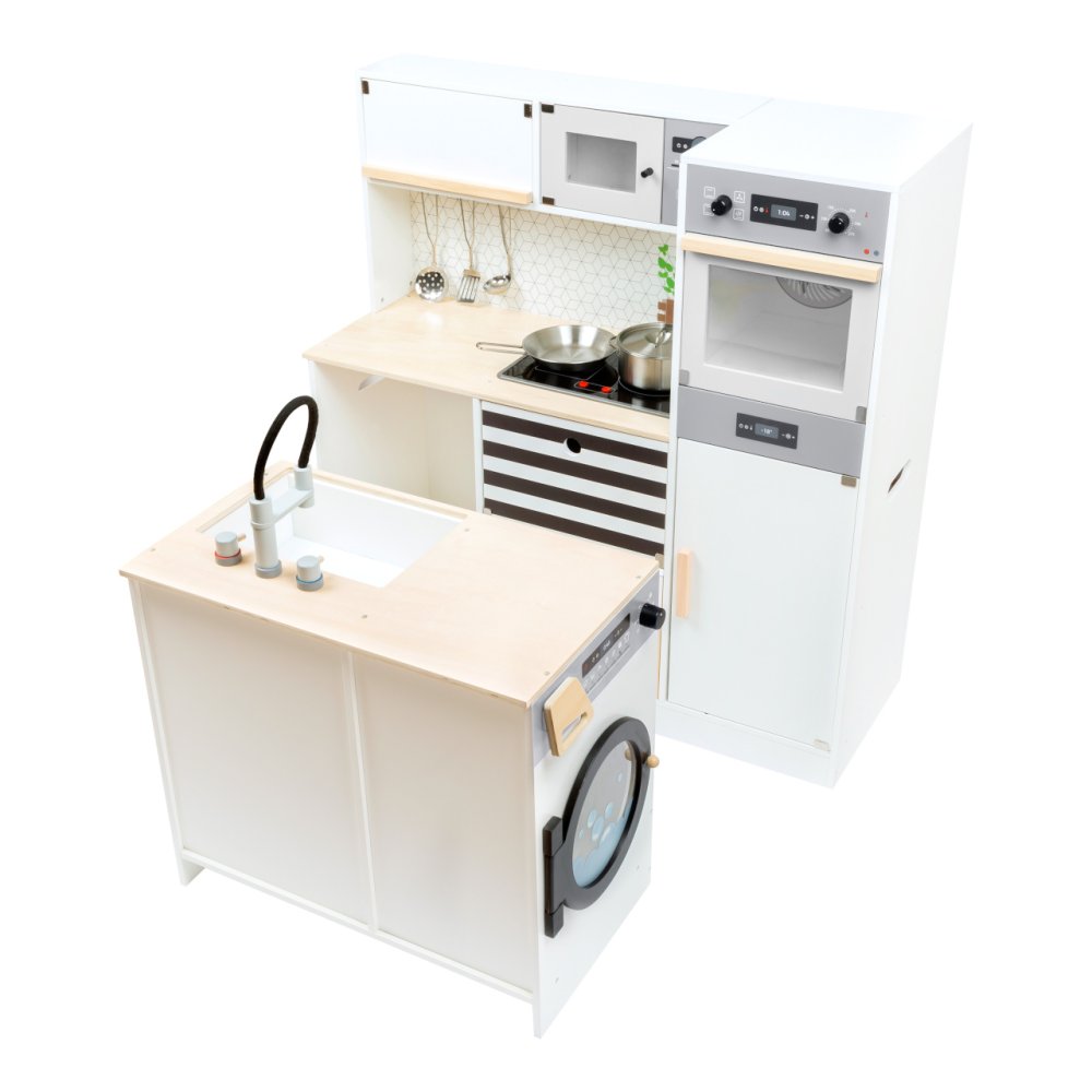 Pro všechny kuchaře a hospodyně! Tato velká, plně vybavená dětská kuchyňka nabízí všechny spotřebiče moderní domácnosti. Díky svému stavebnicovému systému lze sestavit jako rohovou kuchyň, nebo kuchyňskou linku s fungujícím ostrůvkem, nabízí tak mnoho prostoru a možností i pro hru více dětí najednou. Otočné knoflíky cvakají a varná deska s bateriově napájeným (baterie nejsou součástí balení) světlem a zvukem zaručují realistické potěšení ze hry. Skříňky zajišťují dostatek úložného prostoru a jsou vybaveny dvířky. Součástí je vysoce kvalitní nádobí vyrobené z kovu. Pro kuchyňku se nabízí také velké množství doplňkového příslušenství. Výrobek vyžaduje montáž, dodáváno s obrázkovým návodem k sestavení. Hlavní vlastnosti:dětská kuchyňka: sporák, trouba, mikrovlnná trouba, lednice, úložné prostorykuchyňský ostrůvek: dřez, pračka, myčka nádobípříslušenství: hrnec, pánev, otočný talíř, lžíce, naběračka, utěrkasvětelné a zvukové efekty (baterie nejsou součástí balení)multifunkční, různorodé využitírobustní a odolné provedení