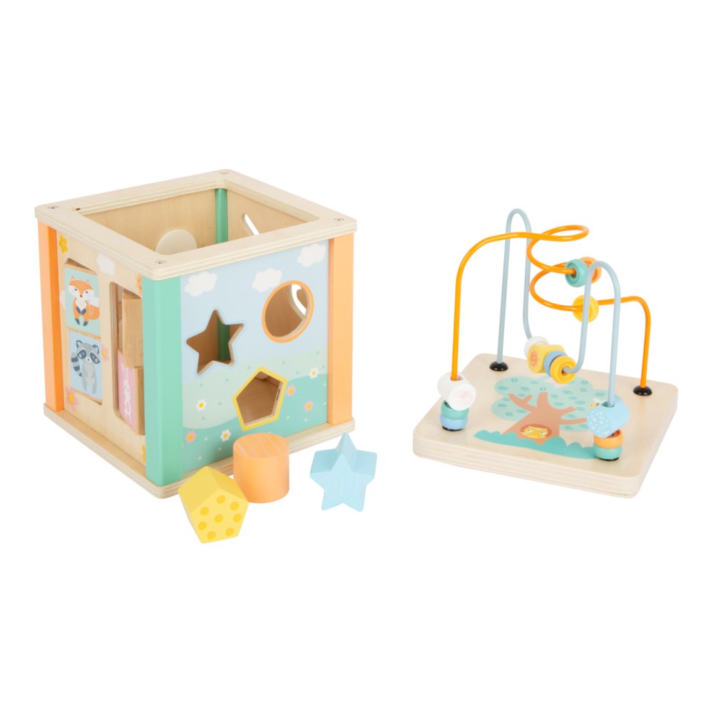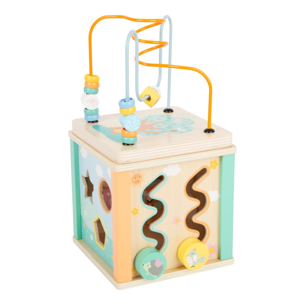 Skládejte, strkejte, klapejte, otáčejte! Můžete si hrát ze všech pěti stran! Dřevěná motoriká kostka nabídne zábavu i nejmenším dětem. Perličkové bludiště, otáčející se obrázky, otvory s kostkami pro vkládání, ozubená kolečka – všechny tyto prvky děti naučí rozevnávat barvy a tvary a také procvičí jejich jemnou motoriku. Trendy pastelové barvy, roztomilé zvířecí motivy, hravé detaily, tato kostka bude pravým poutačem v každém dětském pokojíku. Vrchní víko můžete sundat a uložit do kostky vzhůru nohama, ušetří vám tak kousek místa. Krásná motorická kostka je součástí produktové řady „Pastel“ a zaujme vysokým viditelným podílem dřeva a moderním zabarvením v pastelových barvách. Hlavní vlastnosti: ilustrováno, jemné pastelové barvykompaktní, skladné provedení