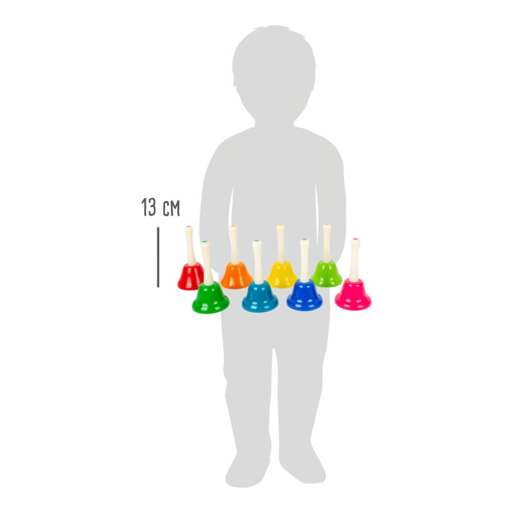 Toto je něco pro vaše uši! Těchto osm zvonečků nerozlišuje jen barva, ale také zvuk. Každý z nich je naladěn na jinou notu – C, D, E, F, G, A, H, C. V balení naleznete také noty s různými skladbami pro začátečníky a malé děti – noty jsou zaznačeny i barevně. Hudební set podporuje u dětí rozvoj rytmu, hudebního sluchu a také koordinace ruka-oko. V notách najdete písničky jako „Strýček Donald farmu měl“, „Rolničky“, „Třpyť se, hvězdičko“. Perfektní také do školek, prvních stupňů základních škol. Hlavní vlastnosti: jasné, výrazné barvy8 zvonků