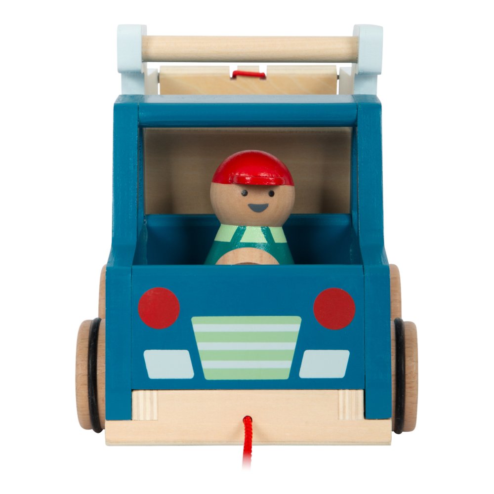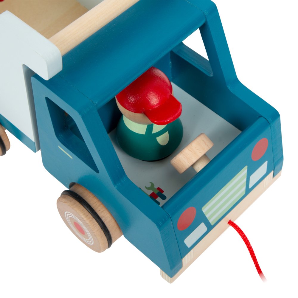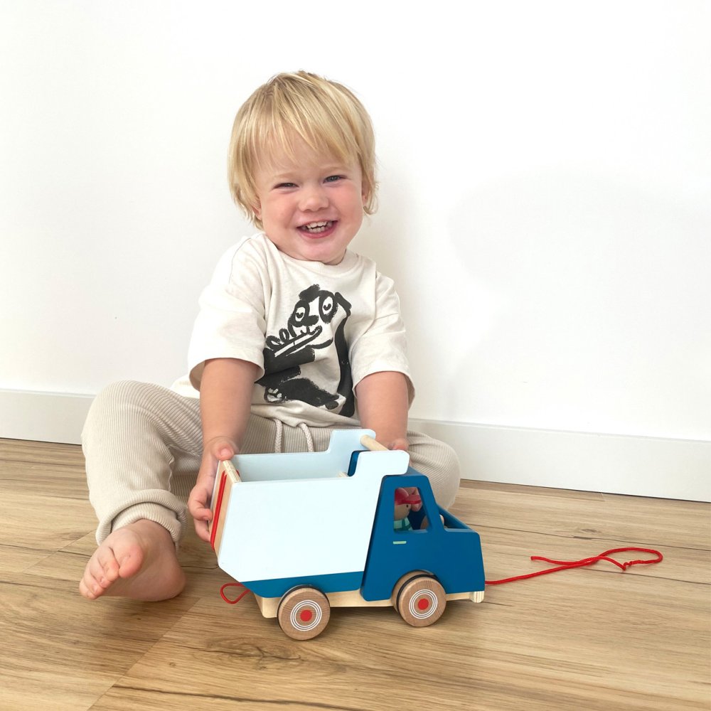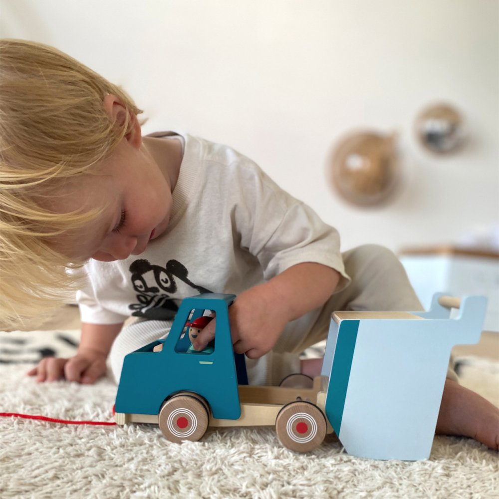 Kompaktní, vysoce kvalitní dřevěný sklápěč v moderním designu je opatřený provázkem k tahání. Může děti provázet na cestách po pokoji a domě. Je vyrobený z odolného dřeva a přináší na staveniště v dětském pokoji spoustu zábavy při učení a hraní. Korbu lze zcela vyklopit. Řidič se během jízdy pohupuje nahoru a dolů. Autíčko má pogumovaná kolečka pro tichý chod. K dispozici je také poutko na zadní straně, pro připevnění dalších vozidel a trénink jemné motoriky. Hlavní vlastnosti: robustní sklápěčlze použít také jako tahací hračkupogumovaná kolečkařidič a korba se při jízdě pohupujídíky poutku lze připojit zezadu i jiná vozidlamoderní design, syté kontrastní barvy, přírodní dřevo