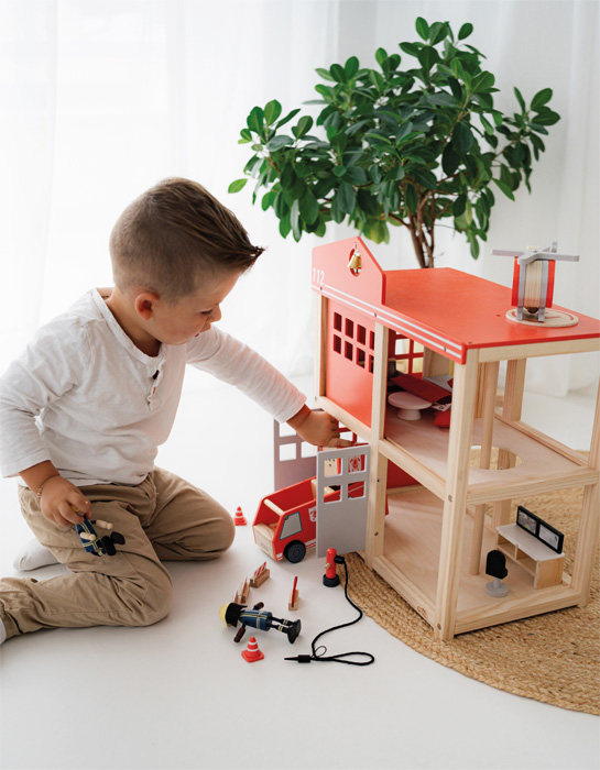 Velká dřevěná hasičská stanice XXL se stane srdcem každého dětského pokoje!Díky bateriovému světelnému a zvukovému panelu si děti mohou užít realistické mise – se skutečnou sirénou a blikajícími světly jako u opravdových hasičů. Modul lze navíc použít na stanici i na hasičském voze, takže zábava nikdy nekončí. Součástí sady je hasičský vůz, vrtulník s funkčním navijákem a dvě ohýbací postavičky hasičů, které jsou připravené vyrazit do akce. Nechybí ani hydrant s hadicí, požární výsuvný panel, stožáry a závorové brány pro napínavé zásahy. Uvnitř stanice děti najdou velitelské centrum a odpočinkovou místnost s patrovou postelí, pohovkou a konferenčním stolkem – vše jako u skutečných hasičů! Do dílny mohou malí hrdinové vjet hasičským autem přes rampu a dveře, zatímco otevřený design stanice umožňuje snadný přístup ze všech stran – ideální pro společné hraní více dětí.Tato propracovaná dřevěná hasičská stanice nabízí dětem nekonečné příběhy, rozvíjí fantazii, motoriku i představivost a přináší do hry spoustu reálných zážitků! Hlavní vlastnosti: velká dřevěná hasičská stanice se zvonkem a sadou příslušenství napájení na baterie 2x AAA (nejsou součástí balení)vhodné pro děti od 3 letotevřený design pro snadný přístup ke hranírozvíjí fantazii, motoriku i představivost