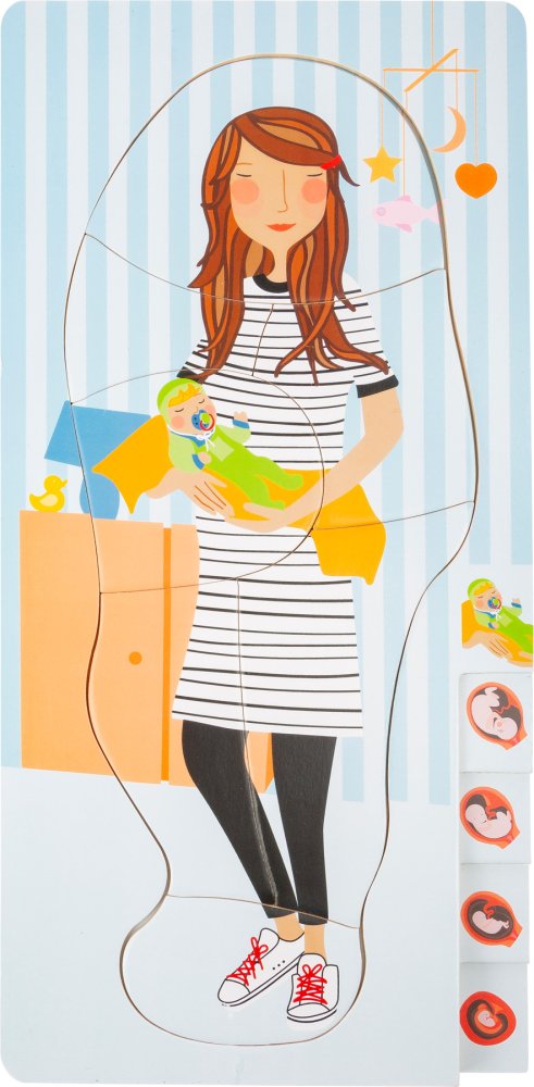 S tímto vrstveným puzzle, které se skládá ze 4 vrstev se mohou děti naučit o průběhu těhotenství. Od prvního týdne až po porod. Kromě nauky o těhotenství puzzle rozvíjí soustředěnost a jemnou motoriku dětí. Může je také připravit na příchod sourozence. Každá vrstva má jinou ilustraci s rostoucím miminkem v břiše. Hlavní vlastnosti: obsahuje 4 vrstvy – 28 dílkůprocvičuje motoriku, soustředěnost a znalosti