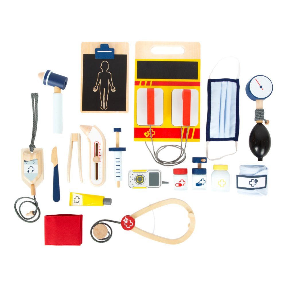 Vše pro naléhavé případy! Tento realistický batoh pro záchranáře má jasné barvy, nastavitelné popruhy a mladí záchranáři v něm najdou všechny „opravdové“ lékařské pomůcky. Dvojitý zip a uvnitř elastické kapsy nabízí mnoho úložného prostoru a rychlý přístup k záchranářským pomůckám z pevného dřeva. Nejlepšími doplňky jsou zřejmě tlakoměr s manžetou a balónkem, otoskop s lupou a defibrilátor s tabulkou pro křídu. Tento inovativní a obsáhlý set lékařských hraček obsahuje mnoho „opravdových“ lékařských nástrojů a přístrojů, s kterými si děti opravdu vyhrají, to vše v jednom batohu. Dále v batohu najdete teploměr, dětské textilní roušky, ampule s otvorem pro vložení stříkačky pro případ nouze, dezinfekční sprej s pumpičkou, infúzi, náplasti na suchý zip, stetoskop, injekční stříkačku s pohyblivým mechanismem, skalpel, pinzetu a rádio. S těmito pevnými hračkami mohou děti objevovat a zkoušet, jaké je to být záchranářem. Ilustrace na lékařských pomůckách dětem poradí rozeznat nástroje a také jim možná zjednoduší jejich použití. Hlavní vlastnosti:tlakoměr s manžetou a balónkem, lze také použít pro zajištění infúzeotoskop s opravdovou lupouteploměr s nastavitelnou teplotouznovu použitelné a pratelné dětské textilní rouškydefibrilátor s křídou pro zaznamenání srdečního tepudalší vybavení: ampule s otvorem pro vložení stříkačky pro případ nouze, dezinfekční sprej s pumpičkou, náplasti na suchý zip, lahvička na léky se šroubovatelným víčkem, injekční stříkačka s pohyblivým mechanismem, stetoskop, skalpel Ocenění hračky:ToyAward 2022