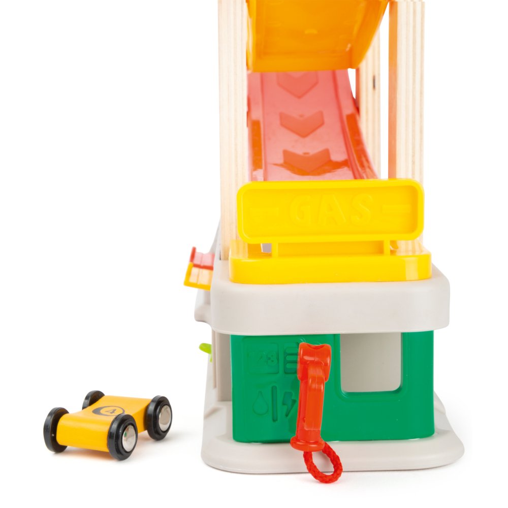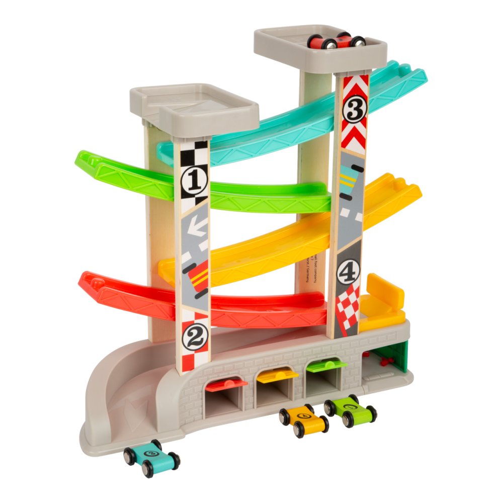 Prohánějte autíčka rychlostní kaskádou, jeden závodník může v těsném závěsu stíhat druhého v atmosféře plné napětí. Dráha je vybavena nejen dvojicí startovacích plošin, ale i zastávkou v boxech, díky které lze rozehrát hry rozvíjející dětskou představivost. U paty dráhy naleznete garáže s otevíratelnými dvířky, kde mohou autíčka odpočívat mezi závody a lze je prakticky využít k úklidu i přenášení hračky. Robustní a odolné provedení kombinuje plastové a atraktivně potištěné dřevěné díly. Díky své jedinečné barevnosti kaskáda snadno upoutá pozornost a podnítí dětskou zvědavost. Hlavní vlastnosti:dráha a 4 různobarevná autíčka3 garáže a tankovací boxatraktivní a odolné zpracování