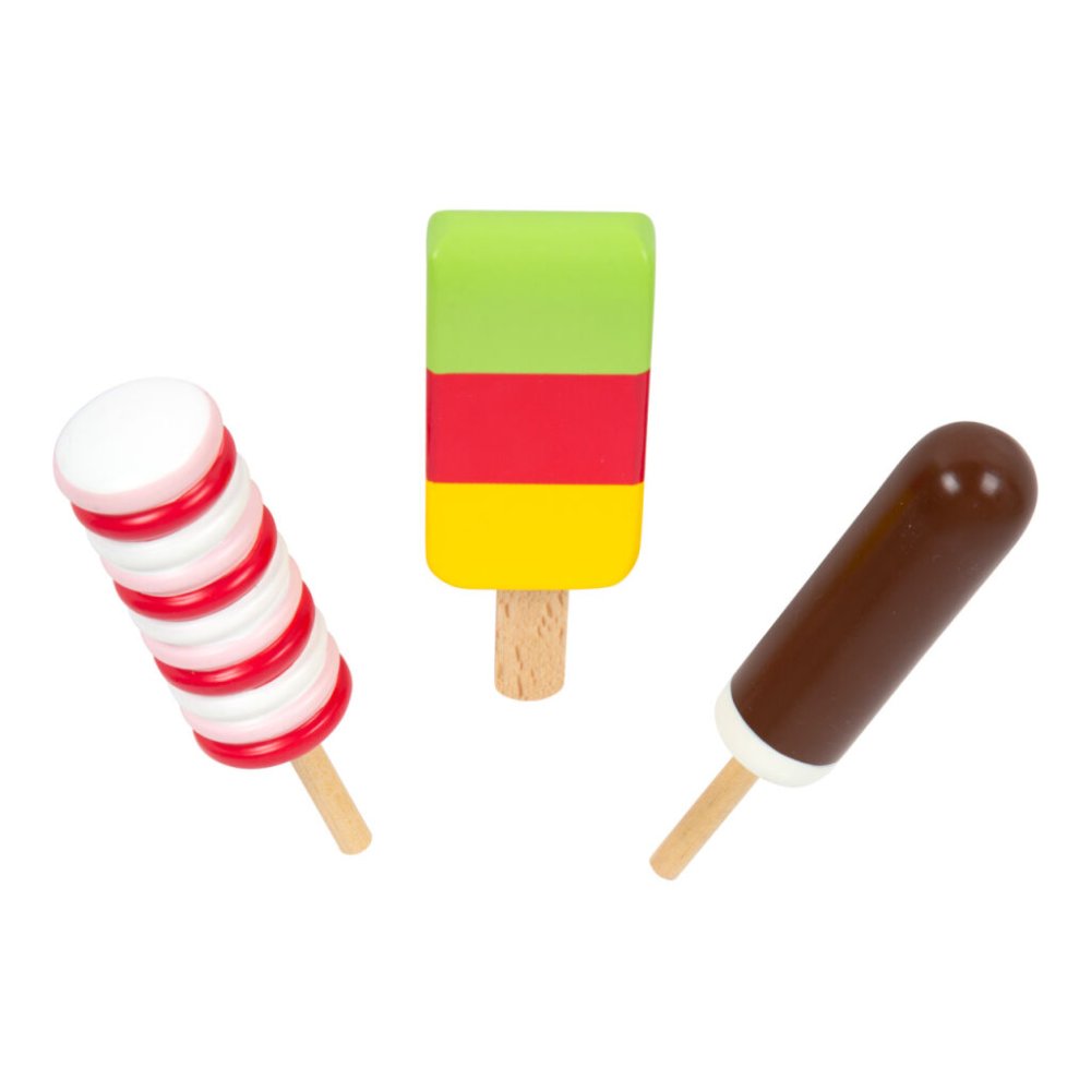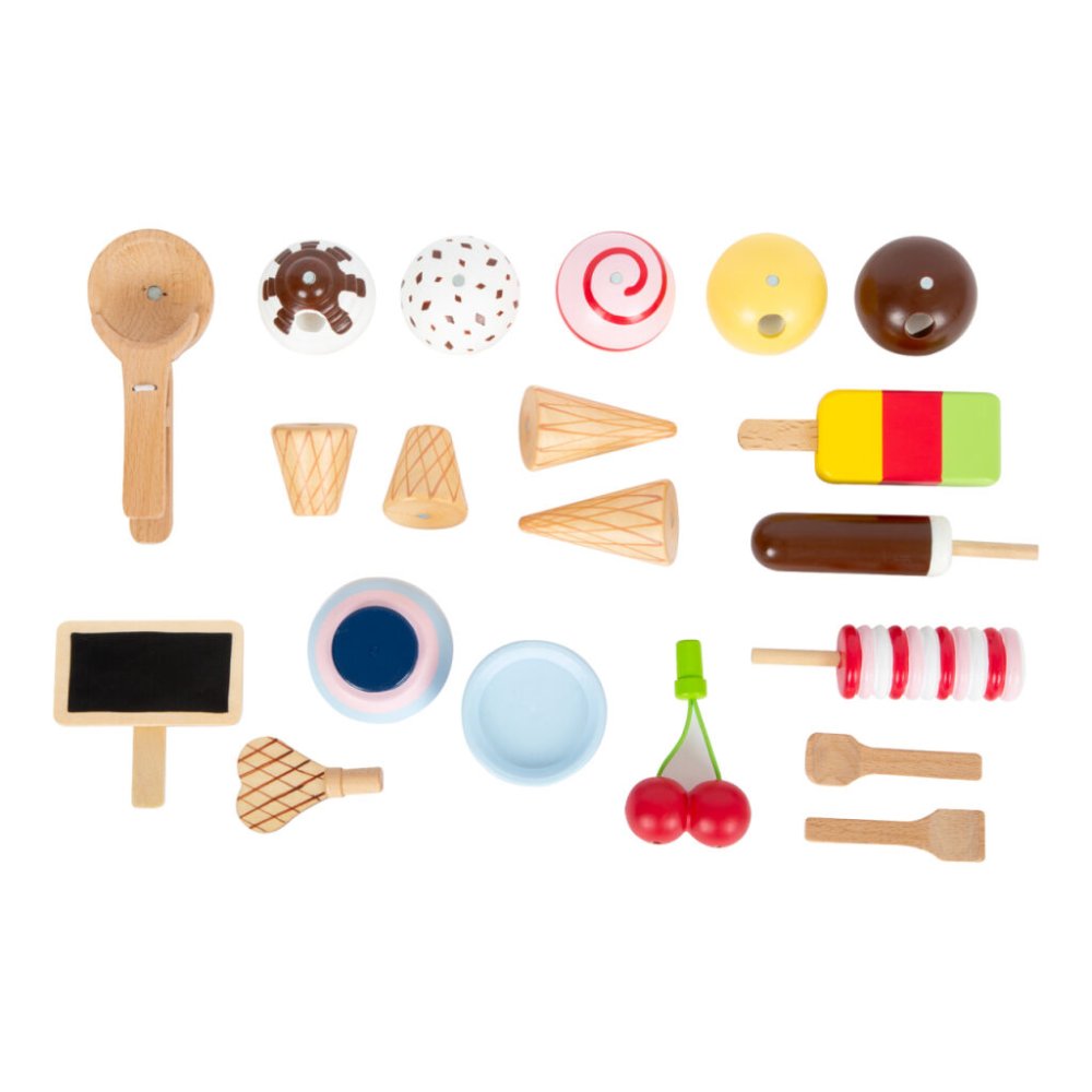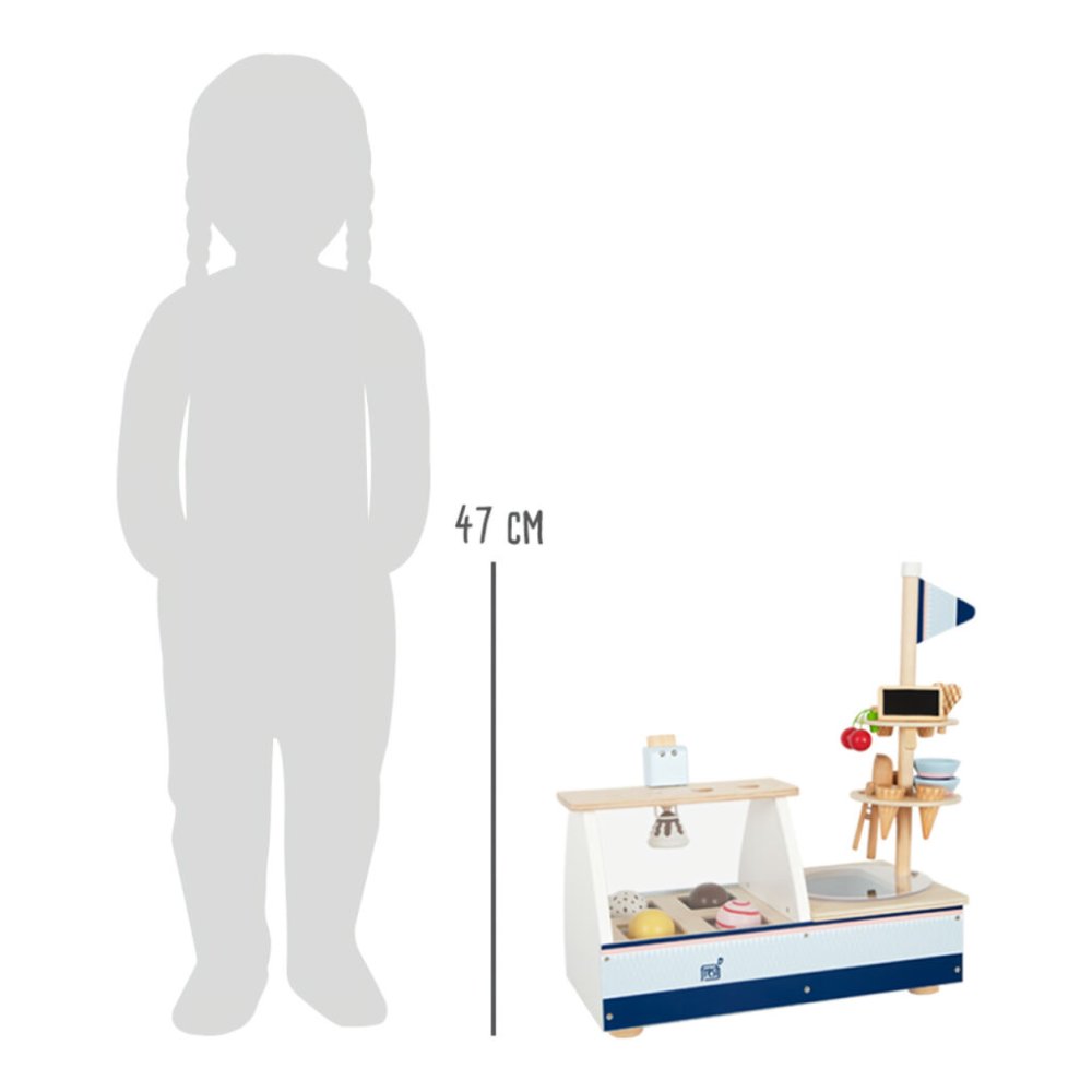Jdeme na zmrzlinu! Tento dřevěný zmrzlinový set je perfektní na léto i zimu. Zmrzlinový stánek je modro-růžový, má také prvky přírodního dřeva, zákazníky nadchne velkým výběrem dezertů a svými funkcemi a příslušenstvím. Můžete si dát více kopečků zmrzliny, nanuk, točenou zmrzlinu, poháry, wafle… a to vše ozdobit třešničkou. Stánek má také plastovou vitrínu, mrazničku s plastovým poklopem, stojan na kornouty. Kopečky zmrzliny a točená zmrzlina jsou magnetické, v balení také najdete tabulku, na kterou můžete psát křídou. Zmrzlinu (vanilku, čokoládu, stracciatellu a jahodu) můžete z vitríny vyndat a dát ji do misky nebo kornoutu. Všechny se také vejdou na wafli. Vytvořte si dezert dle svého gusta. Zmrzlinový stánek má také úložný prostor. Hlavní vlastnosti Zmrlinové kopečky a točená zmrzlina s magnetyOsm různých příchutí zmrzliny, nanukyKopečky se dají skládat na sebe díky magnetůmVelké a malé zmrzlinové kornouty, misky se lžícemi, wafleStánek s plastovou vitrínou, mraznička s průhledným poklopemGenderově neutrální, jemný design