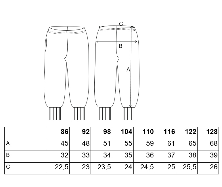 Kvalitní a pohodlné tepláky jsou skvělou volbou při oblékání dítěte na hraní a volný čas. Nohavice tepláků jsou opatřeny širokými náplety, díky kterým tepláky skvěle sedí a nevyhrnují se. Tyto náplety slouží také k upravení velikosti tepláků podle aktuální výšky dítěte – ohrňte náplety tak, aby měly nohavice potřebnou délku. Díky tomuto praktickému střihu se tepláky skvěle přizpůsobí více velikostem a dítěti tak déle vydrží. V pase jsou na gumu a poskytnou tak komfortní oblékání i nošení.