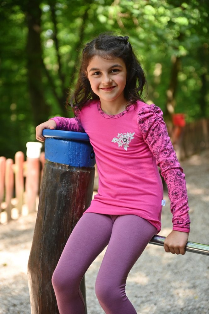 Dívčí tričko v módní barvě s potiskem na rukávech bude slušet všem holčičkám. Holčičí barvu a potisk pivoňky na přední straně trička doplňují dlouhé rukávy, které jsou ve vrchní části nabírané. Tričko je pohodlného střihu a má nažehlené etikety, které nedráždí jemnou dětskou pokožku. Při výrobě trička byl použit termoregulační materiál Outlast® ve smykové variantě. Tento typ materiálu Outlast® je z líce hladký a z rubu má smyčky. Vzhledem k jeho vyšší hřejivosti jej doporučujeme především do zimních měsíců, ale využít jej lze i na podzim nebo na jaře.