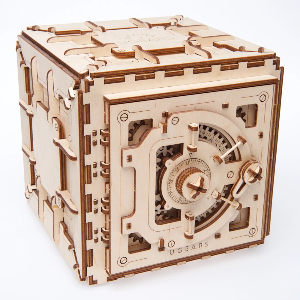 Zkouška Vašeho důmyslu. Stavebnice trezoru vyrobená z překližky. Do úložného prostoru o rozměrech 15x14x10 cm lze uschovat cennosti i drobné listiny, k zabezpečení slouží trojmístný číselný kód uživatelsky zadaný při sestavení. Pohyb propracovaného mechanismu můžete pozorovat několika okýnky. K otevření zadejte první číslici otáčením proti směru hodinových ručiček, druhou ve směru opačném, vpravo, a nakonec třetí opět otáčením doleva. Trezor zamknete prostým otočením číselníku doleva. Pokuste se prolomit kombinaci pomalým otáčením číselníku a pečlivým poslechem pohybů stavítka! Vybaveno detailním návodem k sestavení. Hlavní vlastnosti: 179 precizně vyřezaných dílkůvysoká obtížnost sestavenítrojmístný, uživatelsky volený kódrozměrný úložný prostornavrženo a vyrobeno na Ukrajině