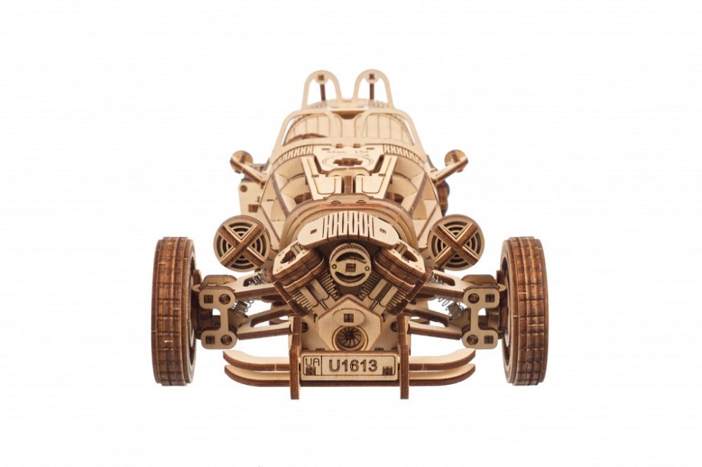 Tento model je skvělým dárkem pro každého, kdo miluje motocykly, klasický automobilový design, nebo miluje modelářství! Auta jsou cool a jedno z nejúžasnějších z nich je Tříkolový UGR-S, dvousedadlové auto navržené pro vysoký výkon a požitek z jízdy. Výkonný motor, sportovně vyladěné odpružení, prvky zvyšující výkon, které upřednostňují rychlost. Mají nízké profily a otevřené kabiny, díky nimž se při jízdě budete cítit spojeni se silnicí a okolím. Tříkolka Ugears UGR-S dokáže jet asi 4 metry v přímém směru, otáčet koly pomocí volantu nebo rukou. Jeho vybavení jsou velké světlomety, zakázkové boční výfukové potrubí, kufr pro umístění do bočního držáku zavazadel a laserové gravírování, pružinový motor a řetězový pohon zadního kola. Na ozdobném předním motoru jsou dva pohyblivé písty. Tento DIY model dřevěné tříkolky má odnímatelný navíjecí klíč, který lze uložit do kteréhokoli ze zavazadlových prostorů na boku modelu. Umístěte řadicí páku do režimu „Park“, vložte klíč do kapoty, proveďte až 15 otáček a poté přepnutím převodovky do režimu „Drive“ nastartujete. Jakmile se tříkolka rozjede požadovaným směrem, můžete sledovat krásné písty a řetězový pohon v akci. Při zvednutí obou stran kapoty se odhalí model pružinového motoru a plynová nádrž. Autíčko je vyrobeno z kompozitních dřevěných dílů vysoké kvality, které vyloupnete z předem nařezaných desek. Stejně jako u všech modelů doporučujeme obrousit veškeré otřepy na dřevěných dílkách a dále navoskovat ozubená kola či jiné pohyblivé části, dokud vše nepoběží hladce. Sada má 457 dílů a patří do pokročilé úrovně obtížnosti. Vše, co potřebujete k sestavení, je přímo v krabici, včetně brusného papíru, vosku a podrobných pokynů v 11 jazycích (angličtina, ukrajinština, němčina, španělština, francouzština, italština, portugalština, polština, japonština, čínština a korejština ). Hlavní vlastnosti: 457 precizně vyřezaných dílkůvýsledný model je řiditelný a schopný samostatné jízdynavrženo a vyrobeno na Ukrajiněobtížnost: pokročiládoba sestavení: 8 hodinnavrženo a vyrobeno na Ukrajině