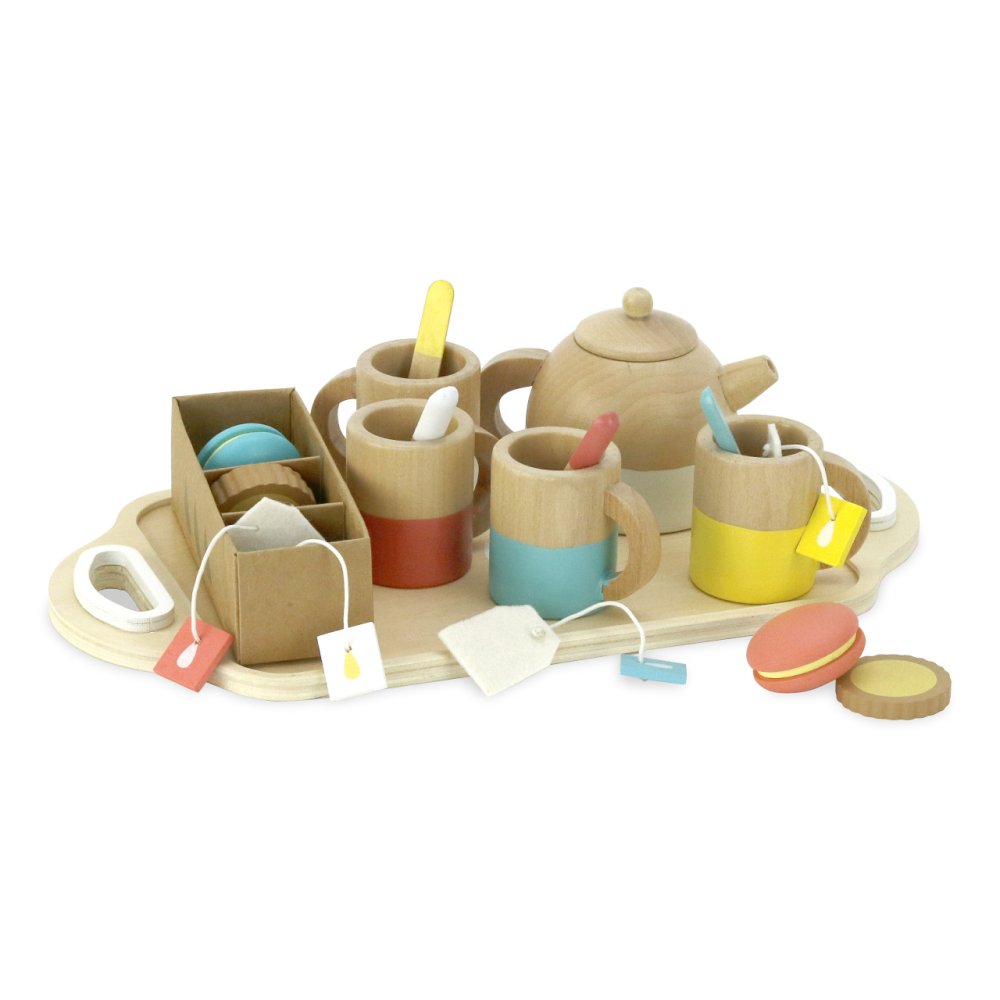 Čas na čaj! Děti budou rády pozívat své plyšové hračky ke hře s touto hezkou dřevěnou čajovou soupravou v jemných barvách. Dali byste si jahodový koláč? A ty malá panenko, chtěla bys makronku namočit do čaje? Souprava obsahuje: 4 šálky, 4 lžíce, 1 konvice, 4 čajové sáčky, 2 makronky, 4 sušenky v krabičce a 1 podnos. Hlavní vlastnosti: 21 dílná souprava v jemných barváchpomáhá rozvíjet komunikační dovednosti