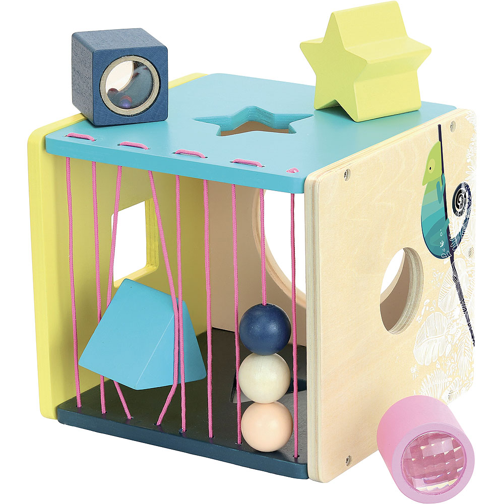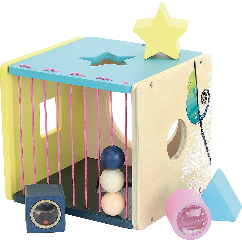 Vkládací dřevěná kostka s 4 různými tvary. Kaleidoskopický válec, zvuková kostka, hvězdička a trojúhelník pomohou rozvíjet jemnou motoriku, senzorické funkce a poznávání barev při vkládání do příslušných otvorů motorické kostky. Z jedné strany má kostka pružné šňůrky s korálky. Hlavní vlastnosti: moderní originální designnové herní prvky v podobě senzorických kostek a pružných šňůrekrozvíjí motoriku, senzorické funkce a poznávání barev