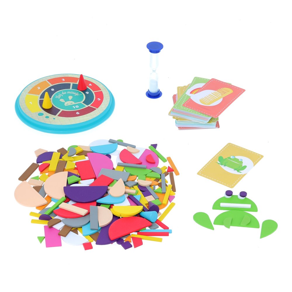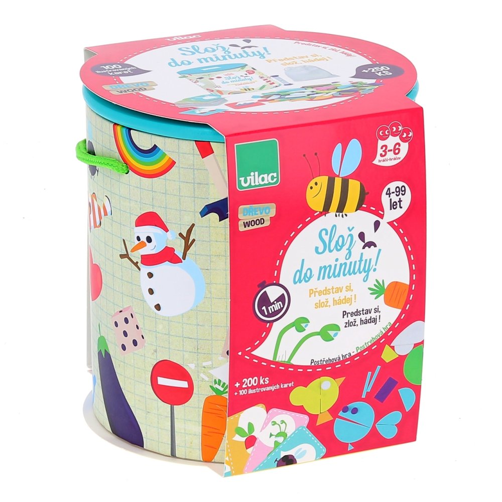 Zábavná hra, která rozvíjí dětskou představivost a postřeh. Vezměte si kartičku a z dostupných tvarů do minuty postavte obrázek. Hra pro všechny od 4 do 99 let. Podle věku hráčů můžete zvýšit čas pro řešení, nebo hrát bez časového limitu. Hra je spolu českým a slovenským návodem dodávána v praktickém kartónovém kyblíku opatřeném potiskem v češtině. Hlavní vlastnosti: 4 figurky, 250 dílků, 100 karet předloh, přesýpací hodiny a bodovací tabulkapro 3–6 hráčůatraktivní zpracovánípraktické balení Pravidla hry Slož do minuty:Slož do minuty SÓLO (pro nejméně 3 hráče, jeden hráč pomáhá ostatním hádat)Všichni hráči položí svou figurku na start bodovací tabulky. Jeden z hráčů si vezme jednu obrázkovou kartu bez toho, aby ji ukázal ostatním hráčům. Bez toho, aby cokoliv říkal, má tento hráč jednu minutu na to, aby složil obrázek z karty z tolika dřevěných dílků, z kolika jen může, aby pomohl ostatním hráčům uhodnout, jaký obrázek je na jeho kartě. Hráč, který uhodne jako první dostává bod a posunuje svou figurku dopředu po bodovací tabulce. Hráč, který obrázek složil, také dostává bod a posunuje svou figurku dopředu po bodovací tabulce. Použitá karta se dá stranou. Pokud hráč, který skládá obrázek, pomůže ostatním hráčům uhodnout, co je na kartě ve stanoveném čase, nebo promluví, nedostane žádné body a karta se vrací do spodu balíčku. Na řadě je poté další hráč. Vyhrává hráč, který jako první dostane figurku na políčko zajíce. Slož do minuty TÝM (pro nejméně 4 hráče)Každý tým položí svou figurku na start bodovací tabulky. Hráči se rozdělí do týmů po dvou nebo po třech. Jeden z hráčů si vezme jednu obrázkovou kartu bez toho, aby ji ukázal ostatním hráčům. Bez toho, aby cokoliv říkal, má tento hráč jednu minutu na to, aby složil obrázek z karty z tolika dřevěných dílků, z kolika jen může, aby pomohl týmu uhodnout, jaký obrázek je na jeho kartě. Tým má jednu minutu na uhodnutí obrázku z karty. Pokud tým uhodne, posune svou figurku dopředu po bodovací tabulce. Pokud hráč, který skládá obrázek, pomůže ostatním hráčům v týmu uhodnout, co je na kartě ve stanoveném čase, nebo promluví, tým nedostane žádné body a karta se vrací do spodu balíčku. Na řadě je poté další tým. Vyhrává tým, který jako první dostane figurku na políčko zajíce. Dokumentace: návod ke hře Slož do minuty (CZ)návod ke hře Slož do minuty (SK)